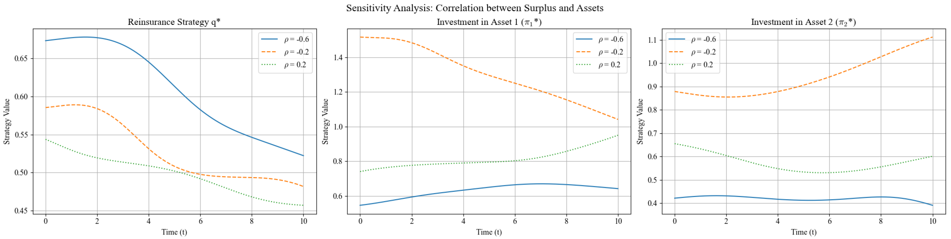 As shown in Figure 11, when the correlation between surplus and asset returns becomes more positive, tail co-movement risk increases. Consequently, the firm significantly raises the reinsurance ratio from roughly to , while sharply cutting the weight on Asset 1, , from down to ; the weight on Asset 2, , is adjusted only marginally. All three trajectories drift slowly downward over time, reflecting Bayesian learning: as more observations accumulate, the correlation estimate stabilizes and the initial conservative stance is gradually relaxed. Overall, is the key driver of the “hedge versus reduce” decision, with Asset 1 remaining the primary lever for dynamic risk control.
