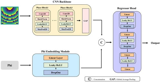 Overview of our PhaseNet framework. A three-block CNN backbone with GAP extracts features from the 20 × 20 phase map, while a Linear → LeakyReLU → Dropout embedding encodes the scalar phi angle. The resulting 128- and 16-dimensional vectors are concatenated and passed through a lightweight regressor head to predict reflectarray antenna gain in a single forward pass.