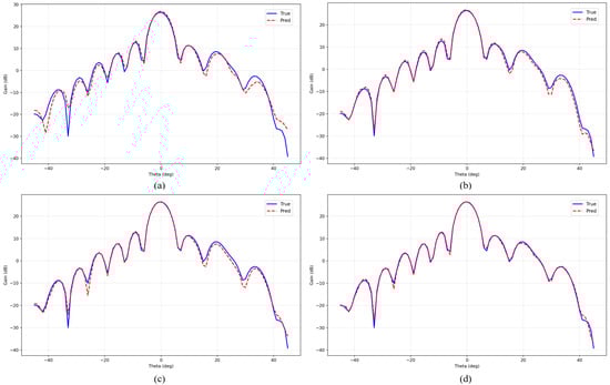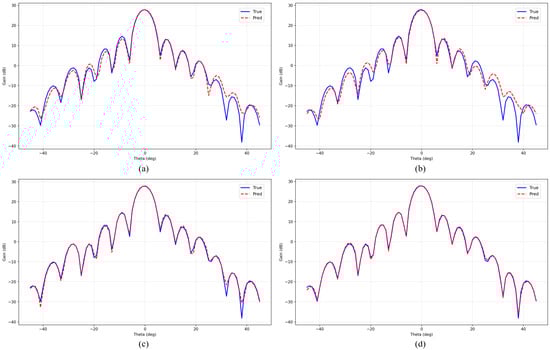 The proposed PhaseNet in this study successfully captures both the main-lobe characteristics and complex side-lobe structures that are essential for accurate reflectarray antenna performance prediction. These results demonstrate that PhaseNet’s phi-embedding module and 2D spatial-processing approach are highly effective for antenna gain value prediction.