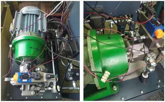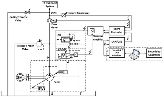 The experimental setup’s control subsystem [40] has a plug-in card amplifier that is type VT-5041. It is especially intended to be used for the setup of an electro-hydraulic proportional valve. A microcontroller MC012-022 [31] sends the control signal to the amplifier. Based on the developed MATLAB/Simulink® software, various control algorithms are implemented in real time. The communication between the microcontroller and the workstation is provided by USB/CAN interface CG150. The control actions are evaluated from the controller and sent to the power stage of the plug-in card amplifier. The plug-in card amplifier drives the proportional valve solenoid and processes the feedback signal regarding the spool position. The control algorithm is implemented as a Simulink® model. This algorithm enables displacement volume regulation in real time. The chosen sample rate of 100 Hz ensures the precise control of the pump flow rate. The realization of the laboratory experimental test setup is depicted in Figure 2.