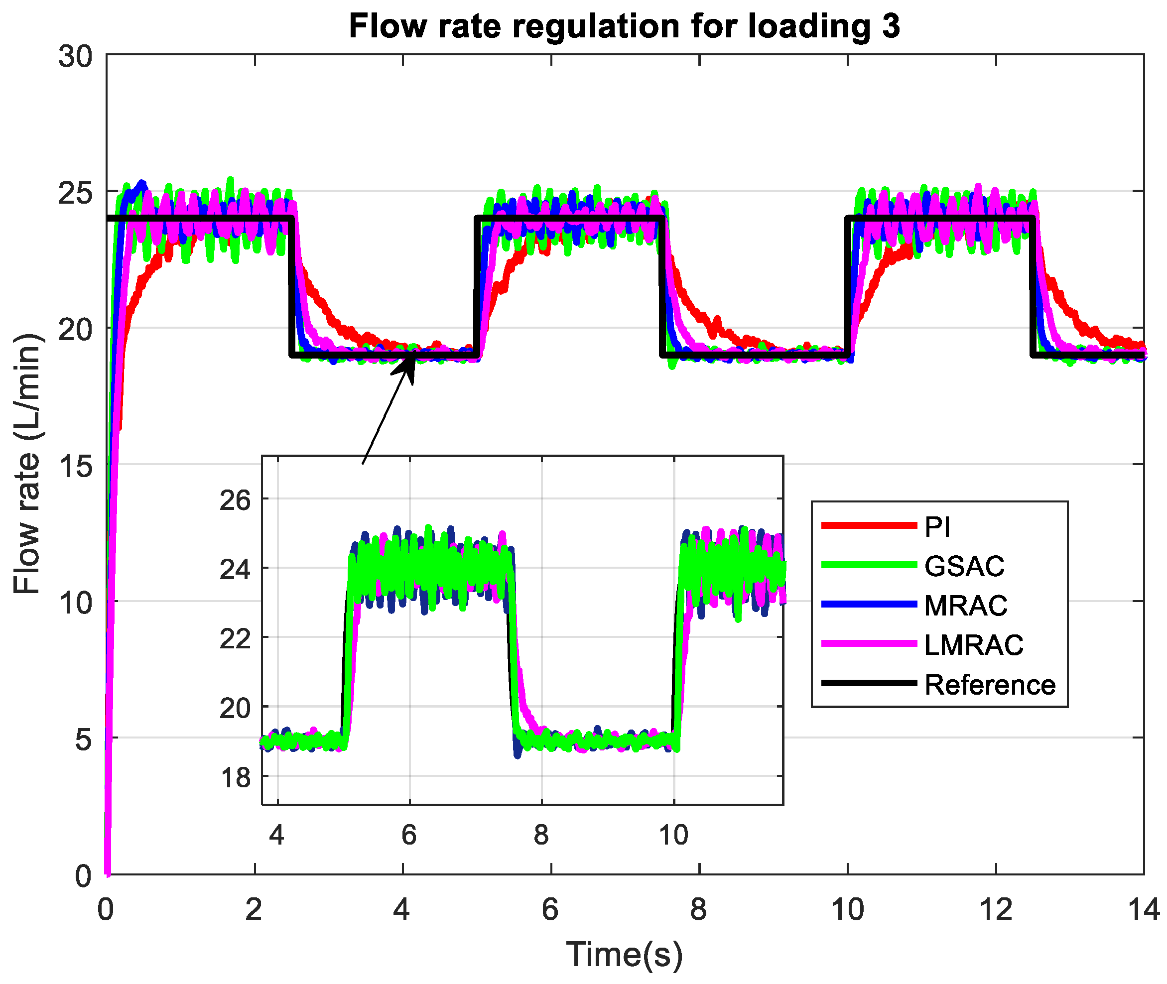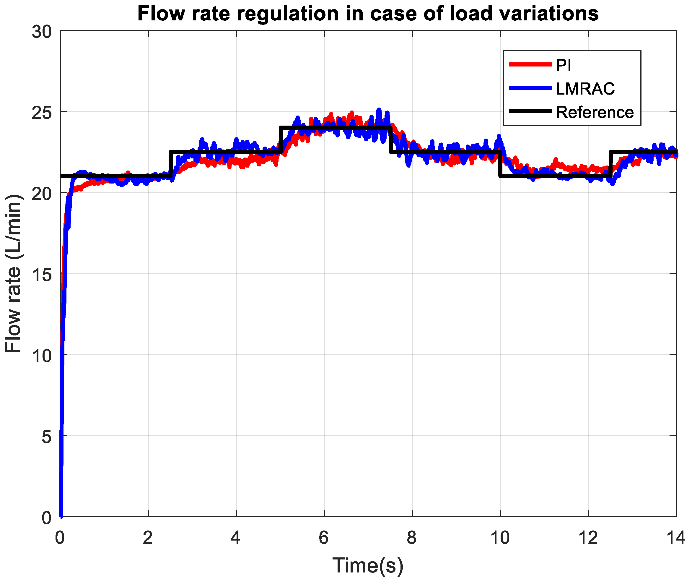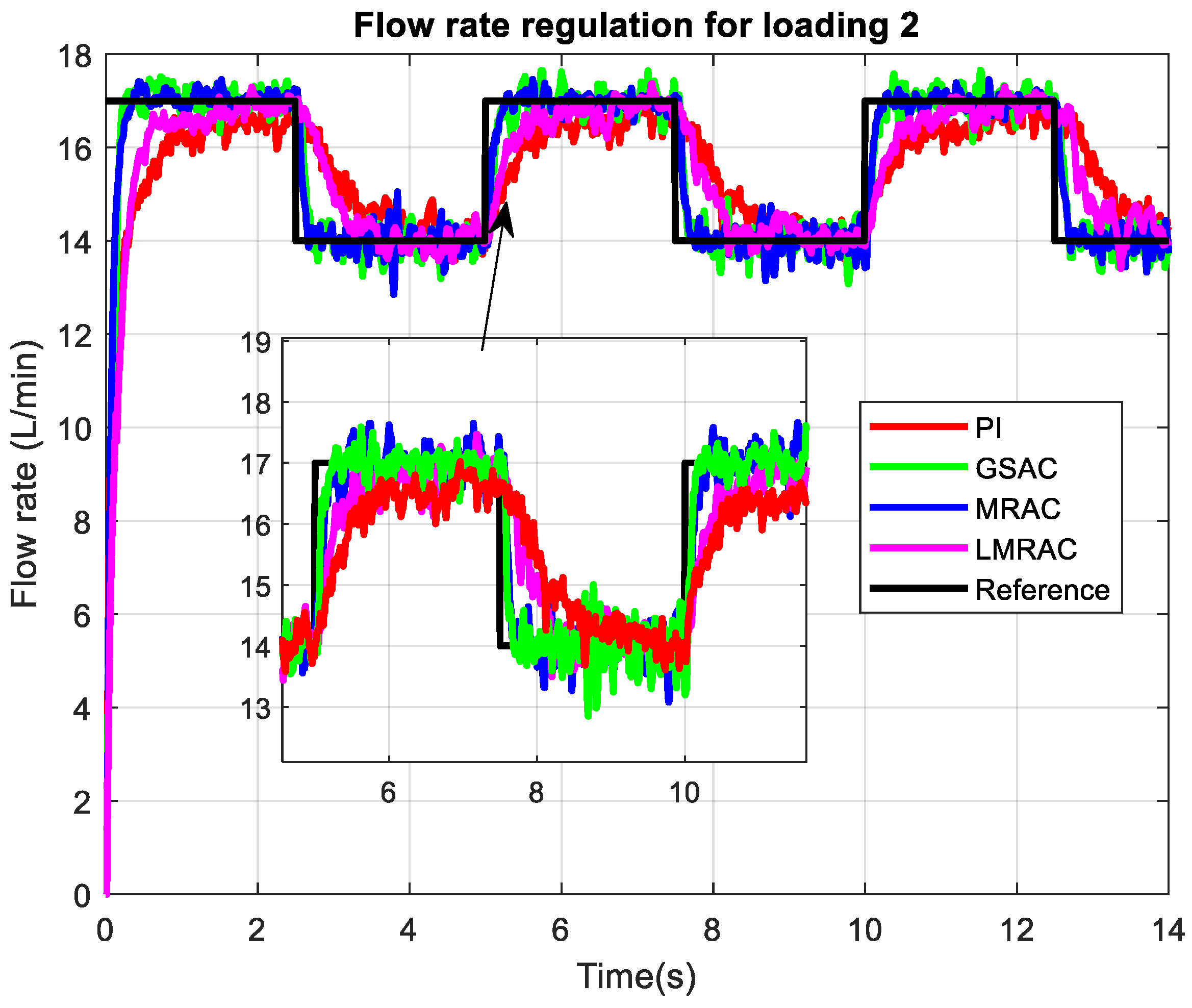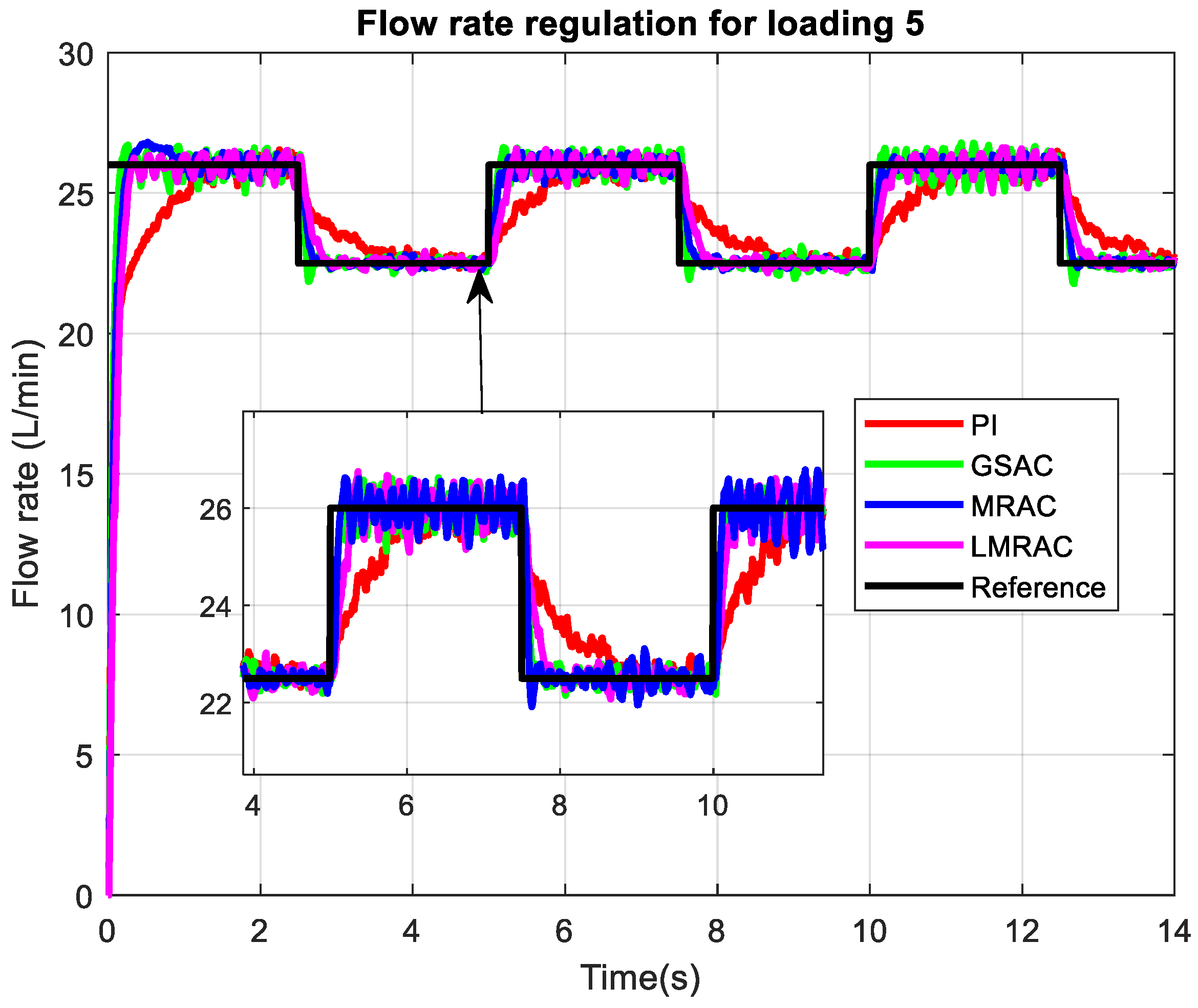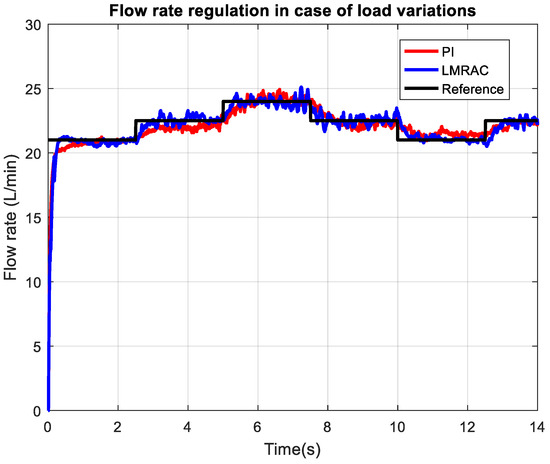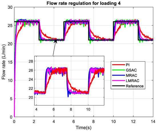 The performance of adaptive controllers is examined for a wide range of loading conditions and compared with a previously designed MRAC, GSAC, and conventional PI controller. Flow rate regulation in four control systems using a Lyapunov-based model reference adaptive control system (LMRAC), model reference adaptive control system (MRAC), gain scheduling adaptive control system (GSAC), and control system with conventional PI controller (PI) was tested for highest loading imposed on the pump output, which is presented in Figure 6. The desired flow rate in this mode is between 14 and 17 L/min.