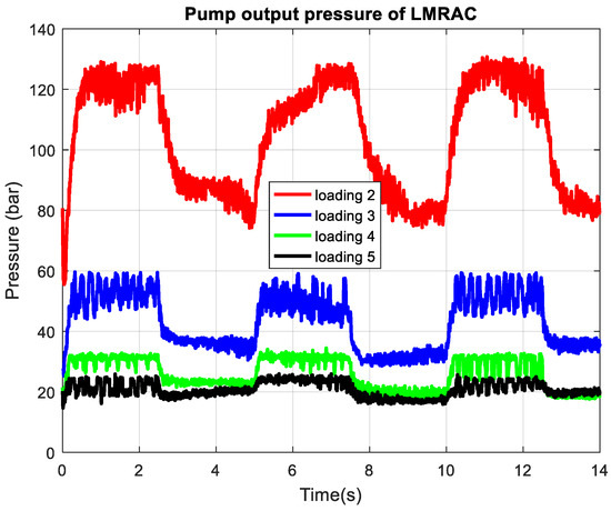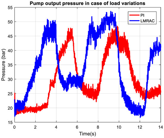 The extension of loading on the system can be appreciated by looking at pump output pressures presented in Figure 12 for LMRAC and in Figure 13 for the conventional PI controller. The pressure increases exponentially with loading from 20 bars to above 100 bars, intermittently reaching 120 bars, which is limited by the pressure-relief valve acting in this range. The output pressure decreases progressively from loading 2 to loading 5, since less restriction yields lower pressure for the same flow setpoint. The controller tracks the reference-induced step changes with transitions between high- and low-pressure states, maintaining the pressure level appropriate to each loading curve. Pressure overshoot and steady-state oscillations are more visible at the highest pressure, reflecting the challenge of controlling more restricted flow and greater pump effort.