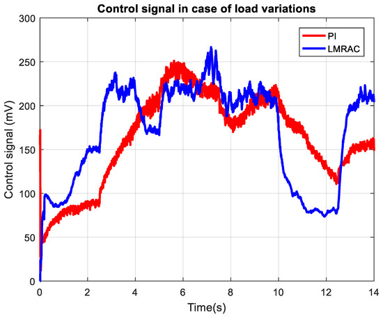 The axial-piston pump output pressure in case of dynamically changing load is presented in Figure 15. This result reveals real-time insight into how the control system changes with various types of load fluctuations. During the experiment, the pump output pressure exhibits marked transient peaks and grooves that correspond to each load disturbance. Figure 16 depicts the control action of the LMRAC in response to dynamically varying load conditions. As can be seen, the control signal changes rapidly in order to compensate for each pump load. In this way, the system maintains the desired flow rate level. The control signal for the adaptive controller is smoother than one for the conventional PI controller, which is more appropriate for the operational mode of the electro-hydraulic proportional spool valve.