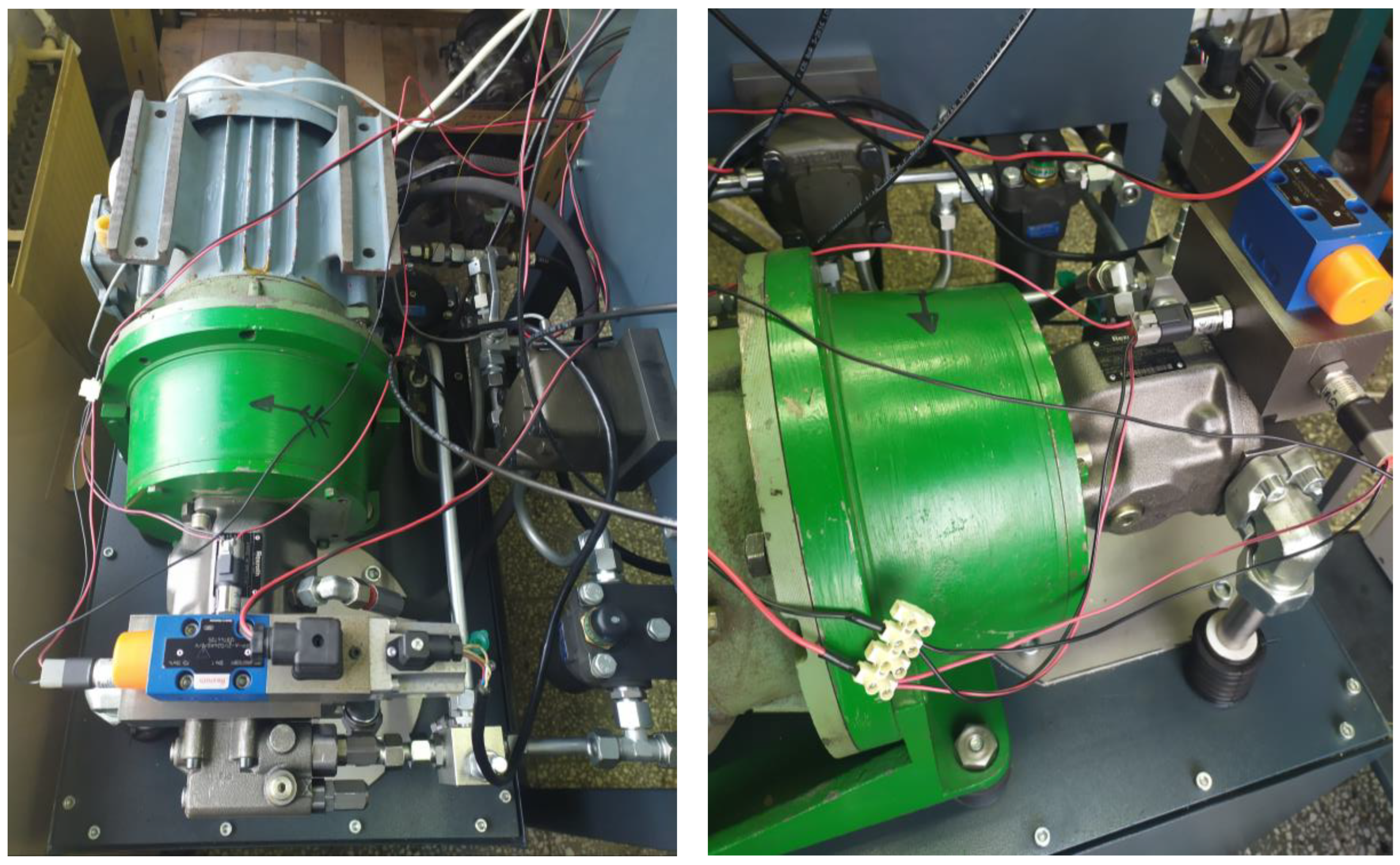 The plant is a common model of a variable-displacement axial-piston pump A10VSO [38]. The displacement volume of the pump is 18 cm3. The pump is driven by an electric motor with a power of 7.5 kW at a nominal speed of 1500 rpm. The pump is equipped with a proportional spool valve VT-DFP [39] serving as an electro-hydraulic actuator for changing the swash plate swivel angle, which leads to a proportional regulation of the displacement volume (resp. pump flow rate). The system is equipped with a main pressure-relief valve protecting it from pressure overload. The different load modes of the pump are set by a manually controlled adjustable precision throttle valve. The system allows for measuring flow rate and pressure in the pump discharge pipeline.