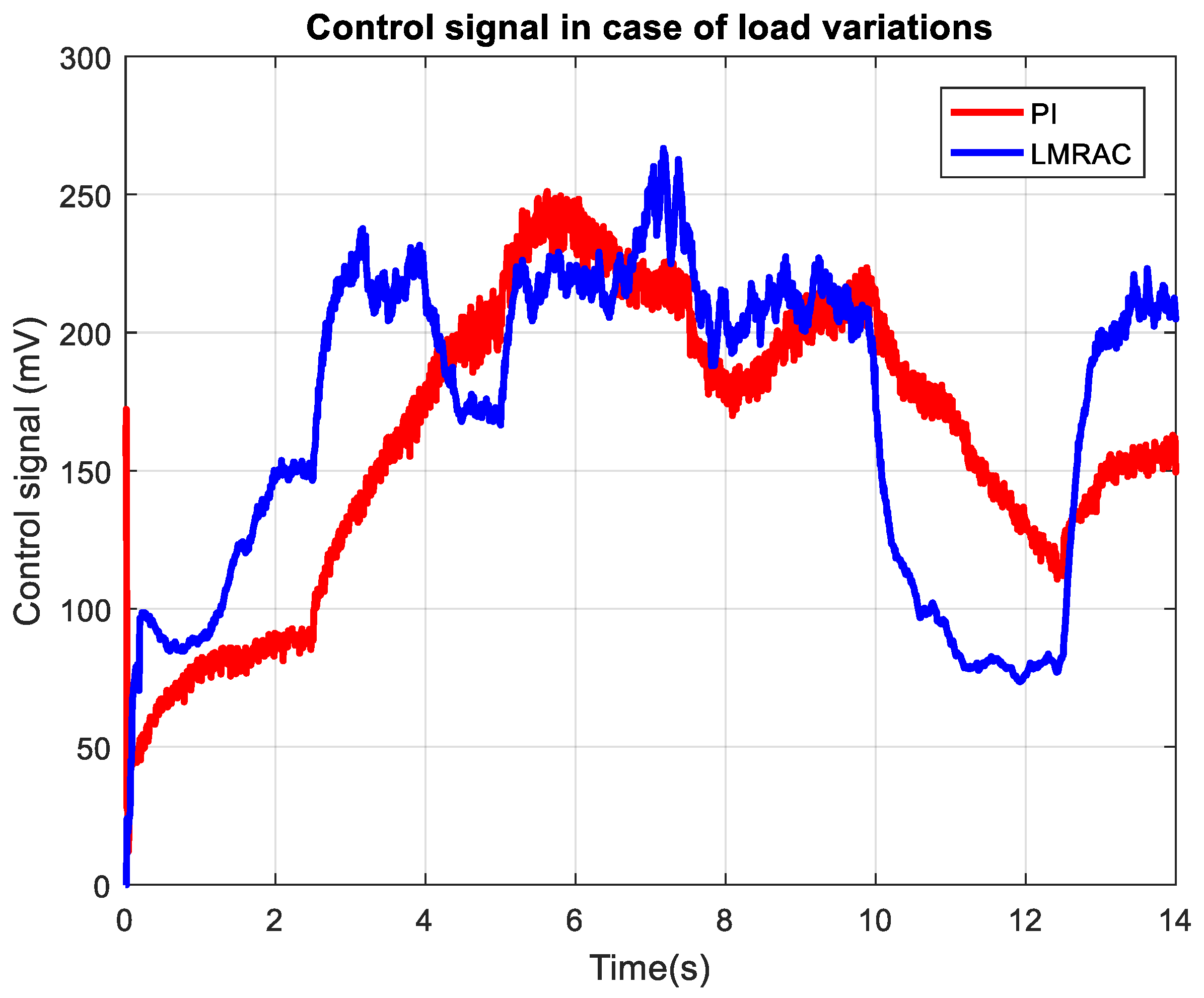 Notable differences emerge in the control action for the PI controller compared to the adaptive controllers. The PI controller exhibited consistent low frequency behavior with reduced, but not absent, noise sensitivity. The signal shape demonstrates the inherent limitations of fixed-gain regulation. By keeping the same waveform structure, yet not able to fully compensate for changing plant gain, the result is a bigger output error and less differentiated response among loading curves.