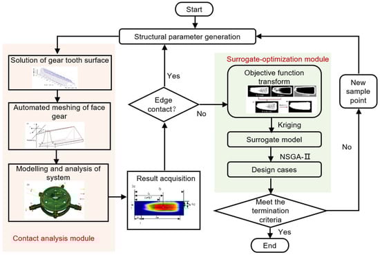 To solve this problem, we proposed an automatic mapping method for the parameters of face gears to discrete node coordinates and an image-based automatic extraction and evaluation method for FEA results to address the challenges in the automatic optimization design of FGST. A computer-aided optimization design algorithm framework for FGST driven by FEA results is given, achieving analysis and optimization integration methods. In Section 2, the analysis and optimization integration algorithm framework considering non-edge contact proposed in this paper is introduced. In Section 3, a mapping method for modification parameters to the discrete mesh is introduced. In Section 4, an image-based method for extracting and evaluating the contact performance of FEA results is introduced. In Section 5, an example is presented to achieve analysis and optimization integration. In Section 6, the conclusion is summarized.