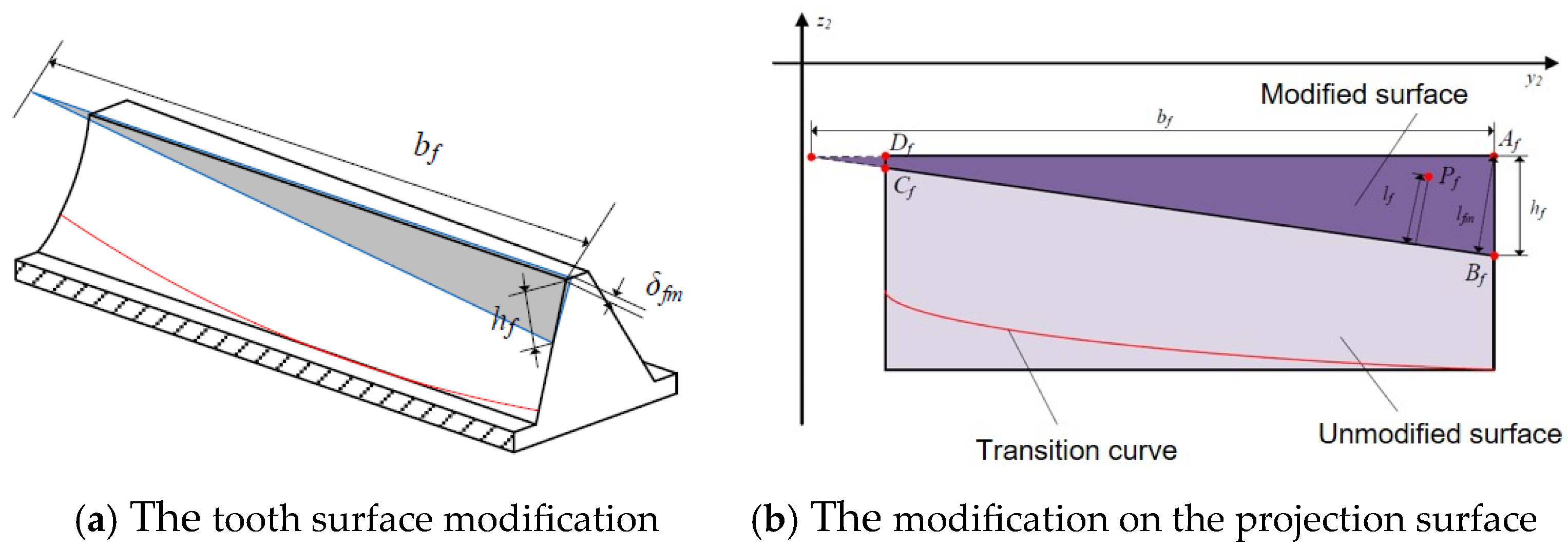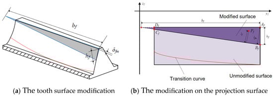 At the top of the outer radius teeth of the upper and lower face gears, which is the area where the face gear pair meshes, the tooth surface of the face gear is modified, as shown in Figure 3a. δfm is the maximum modification of the outer diameter, bf is the modification in the tooth width direction, which may be greater than the tooth width of the face gear, and hf is the modification in the tooth height direction. The projection of the gear tooth surface rotating to the y2o2z2 plane is shown in Figure 3b, where lfm is the distance from the outer diameter in tooth crest to the modification starting line, and lf is the distance from a point Pf in the modification area on the rotating projection surface to the modification starting line BfCf.