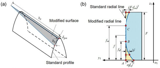 The modification parameters for pinion: (a) schematic diagram of tooth crest modification, (b) tooth profile modification parameters.