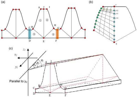 Calculation of nodes in the face tooth. (a) Partition of multiple teeth; (b) calculation principle diagram of nodes on the tooth surface; (c) schematic diagram of the spatial relationship between key points.