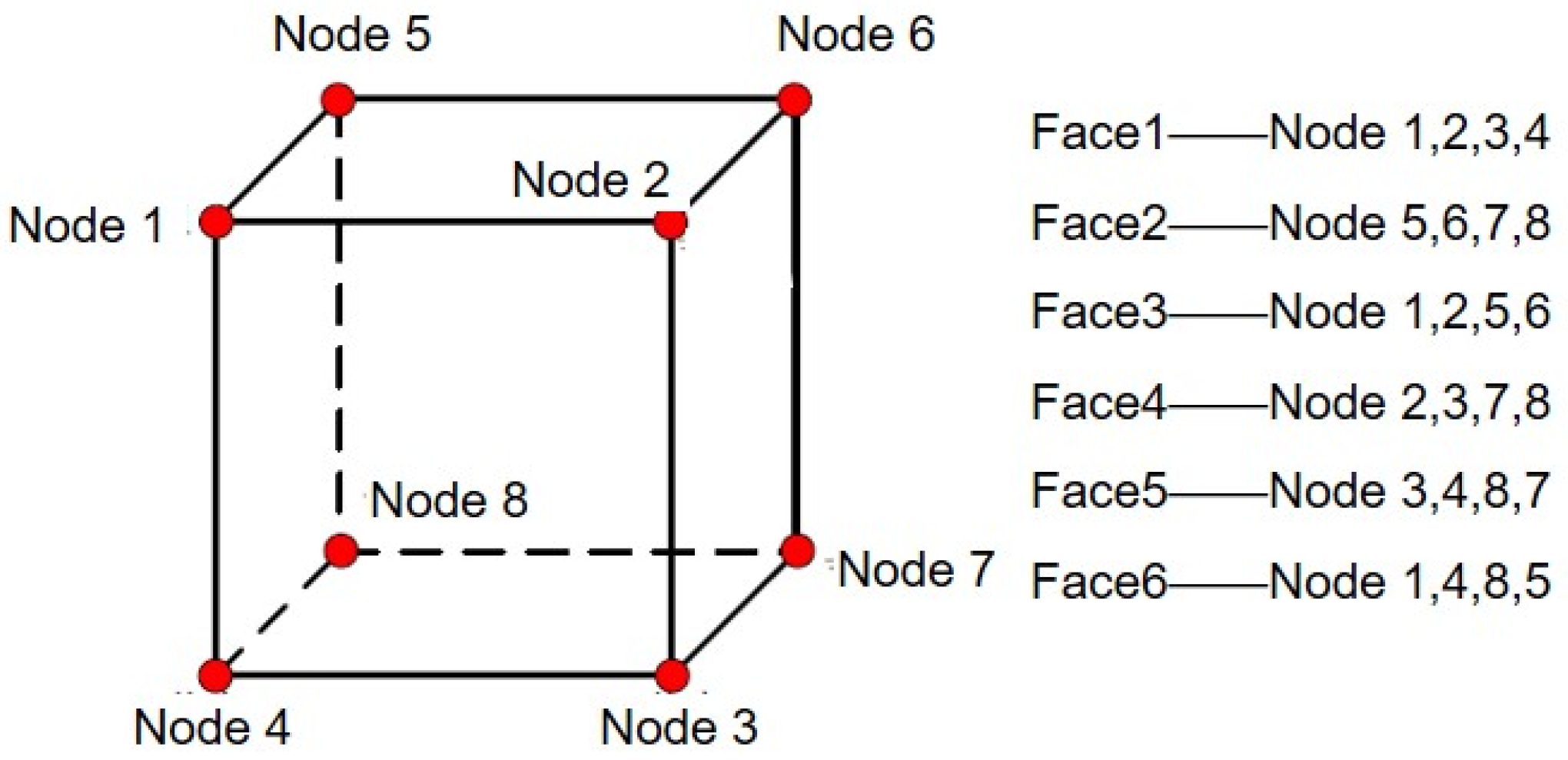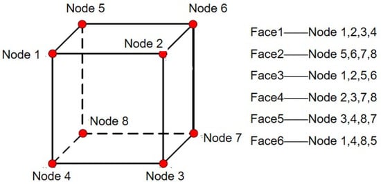The three-dimensional coordinates of each node are written into the inp file, in the following format: node number, x coordinate, y coordinate, z coordinate. The node coordinates are written in the order shown in Figure 7. The numbering of each face of a hexahedral element in ABAQUS is specific, and the face numbering is determined by the four nodes connected to it, as shown in Figure 7. Node i (i = 1–6) is the ith input node when creating the elements. According to the right-hand rule, a circle is formed in the order of nodes 1, 2, 3, and 4, with the thumb pointing towards the inside of the elements.