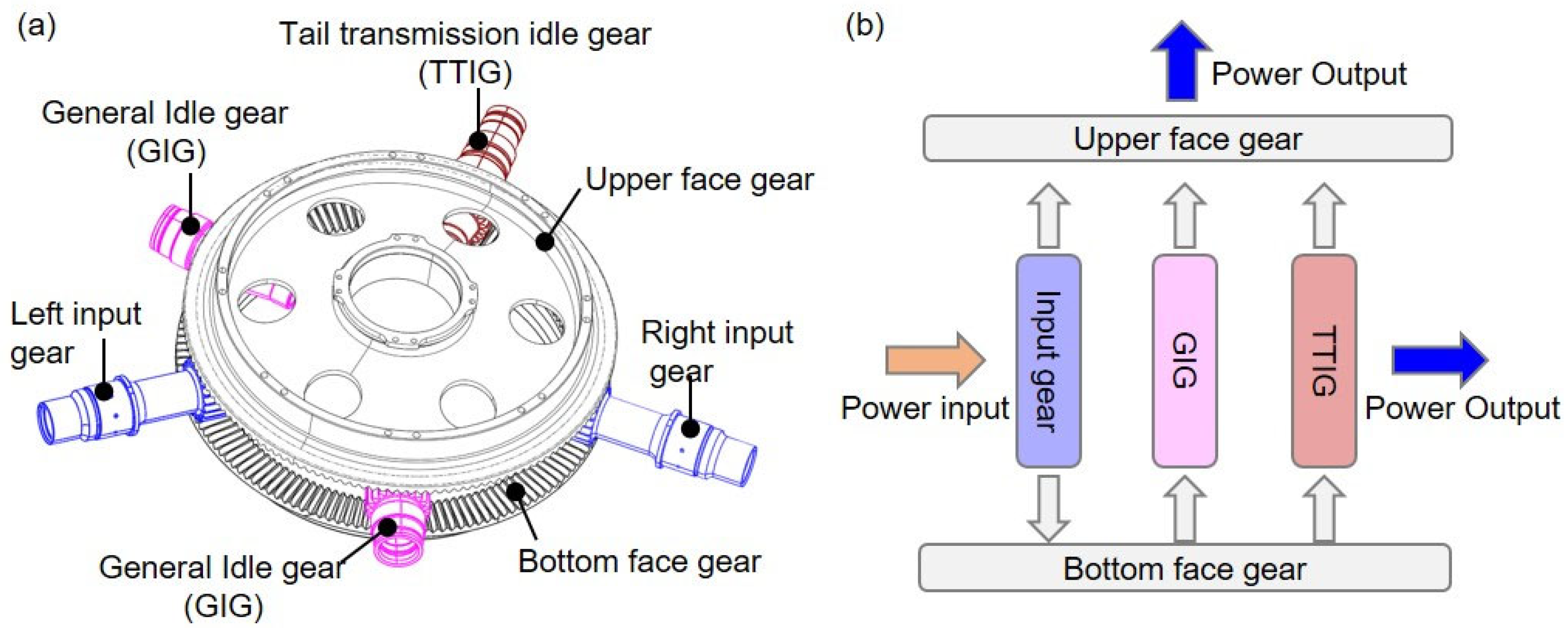 The structure of the FGST system is shown in Figure 1a. The system consists of seven gears, including upper and lower face gears, left and right input gears, left and right idler gears, and the tail gear. Generally, under the condition of conventional dual engine input power, the left and right input gears are the input of power for the FGST system, transmitting power from the input gear to the upper and lower face gears, which act as receivers of power, and rotate in opposite directions. The upper gear and tail gear are the outputs of the FGST system. As shown in Figure 1b, the upper face gear outputs power to the top rotor, while the tail gear outputs power to the tail rotor as needed. The left and right idler gears and the lower face gear play a role in improving the overall stiffness of the FGST.