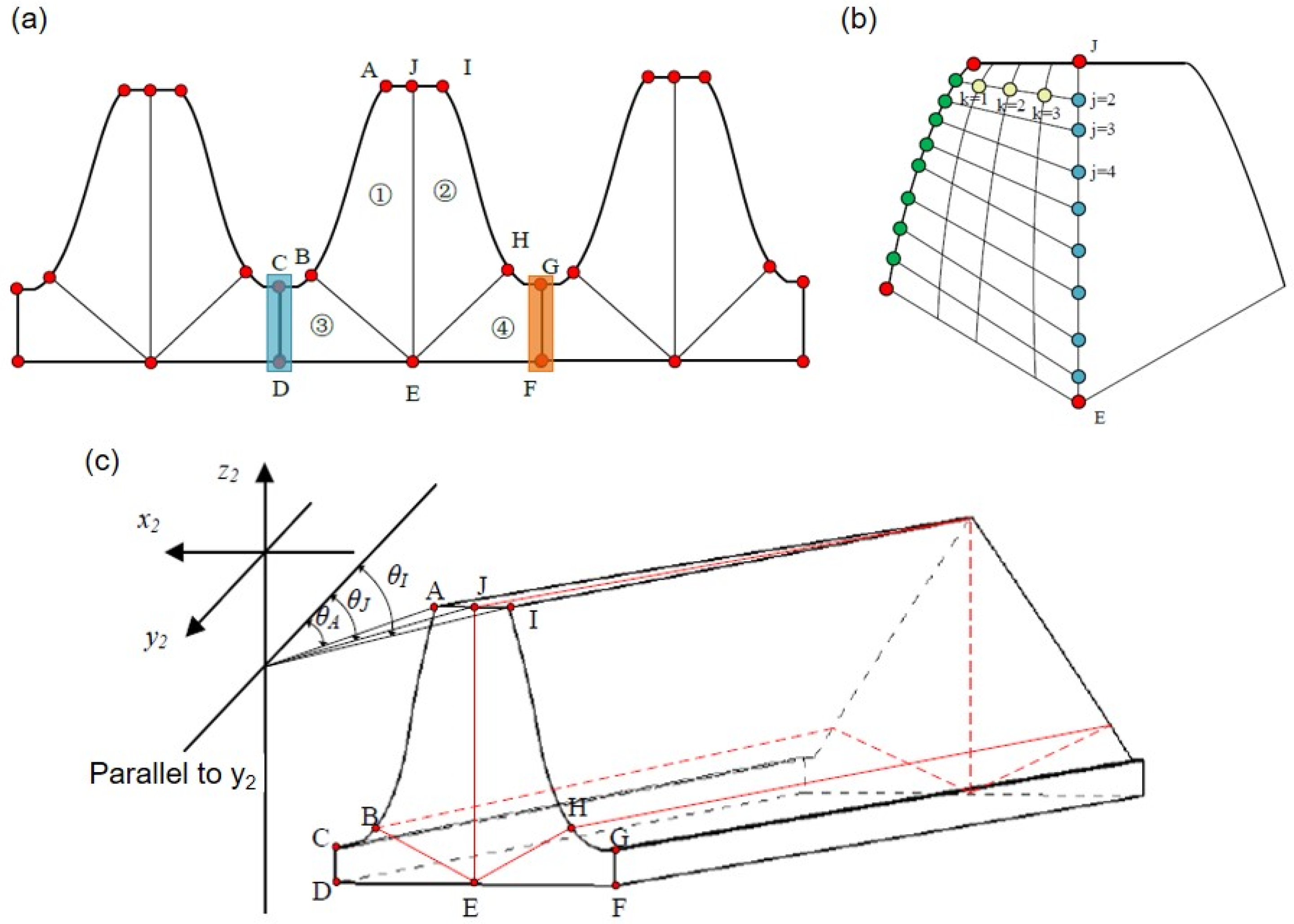 Then the angle θJ between the key point J on the tooth crest centerline and the y2-axis can be calculated as