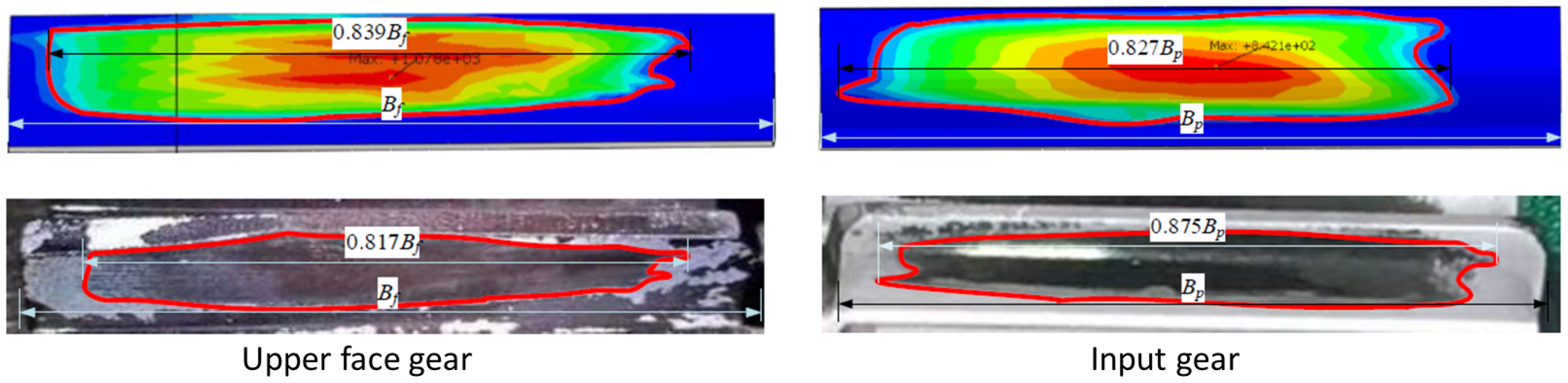 - The simulation results of the upper face gear show that the ratio of the length of the tooth contact imprint in the tooth width direction to the entire tooth width of the face gear is 0.839. The value obtained by test is 0.817. The deviation between the simulation and the experimental results is 2.69%.