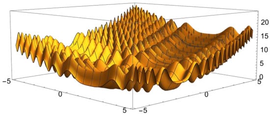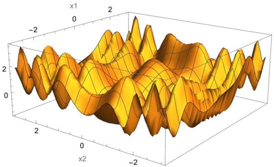 Compared with Figure 1 (where you can actually inspect the optimum), one can perceive the potential difficulty of finding the global minimum of such a function, even if this example is merely a two-dimensional box-constrained instance (n = 2; m = 0) of the general problem (1) and (2). Clearly, to find the global optimum using analytical tools seems very tedious, if at all possible (f(x1, x2) has many stationary points that should be analyzed one by one). Obviously, a local scope search approach, as outlined above, could easily “get stuck” at a locally optimal solution on the hilly landscape shown in Figure 2. Therefore, some global search strategy that enables the thorough exploration of the feasible box region −3 ≤ x1 ≤ 3, −3 ≤ x2 ≤ 3 seems far more suitable to produce a credible numerical solution estimate. Higher-dimensional GO problems could become increasingly difficult to solve; this aspect will be illustrated later on.
