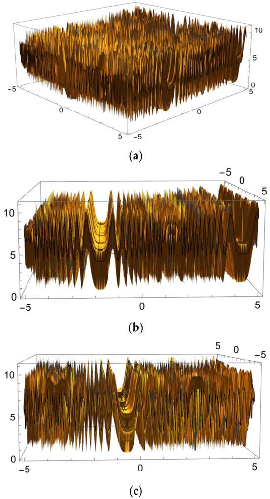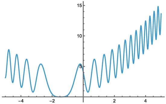 In (4), s > 0, ak > 0, and bk > 0 for k = 1 and kmax (with a chosen kmax > 0 integer) are scalar parameters chosen to make a test problem more or less difficult by adjusting their values. Specifically, increasing the value of the scale parameter s makes the function more similar to an “easy” separable convex quadratic function. Increasing the amplitude multiplier ak for any k = 1, …, kmax results in a higher effect of the added oscillating terms, while increasing bk for any k = 1, …, kmax leads to higher oscillations of the arguments in the squared trigonometric terms. Finally, Pk(.) denotes an in-principle arbitrary function that attains its unique minimum with value 0 at x = x*, for k = 1, …, kmax.