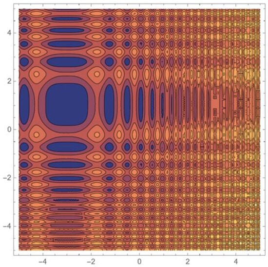 The parameterization of both functions is defined by xopt = l + RandomReal[](u-l), noting that the Mathematica function RandomReal [] returns an algorithmically generated pseudorandom real number between 0 and 1. Figure 4 displays a one-dimensional test function instance; Figure 5 and Figure 6 show, respectively, the surface plot and contour plot of a composite test function based on two of the one-dimensional test functions, with a component-wise randomly generated solution point x*.