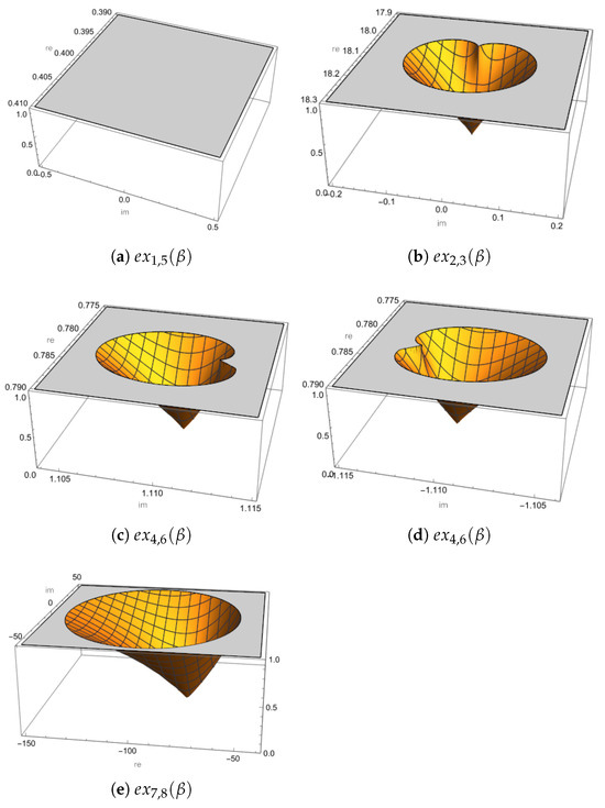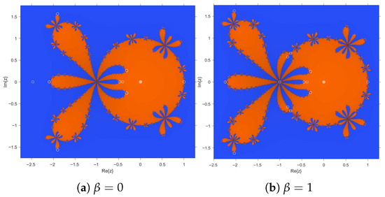 The iterative methods used in this section are presented in Table 10. This table takes into account all the conditions established in Table 9 with respect to , with the aim of guaranteeing fourth-order convergence. In particular, the parameter is selected, given its favorable behavior observed in the dynamical analysis.