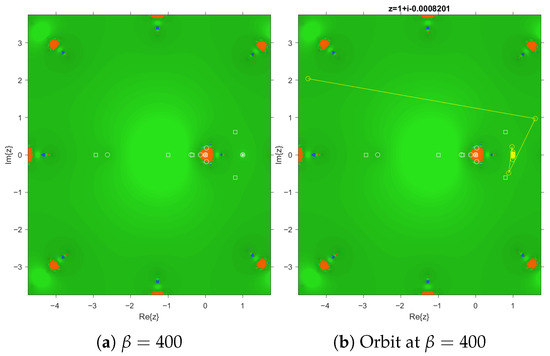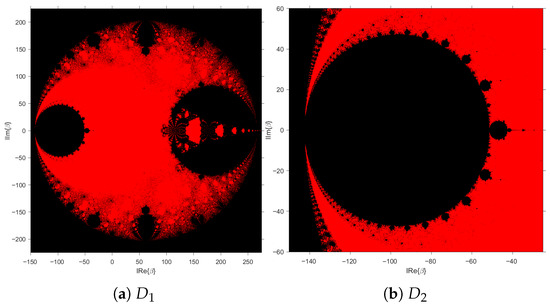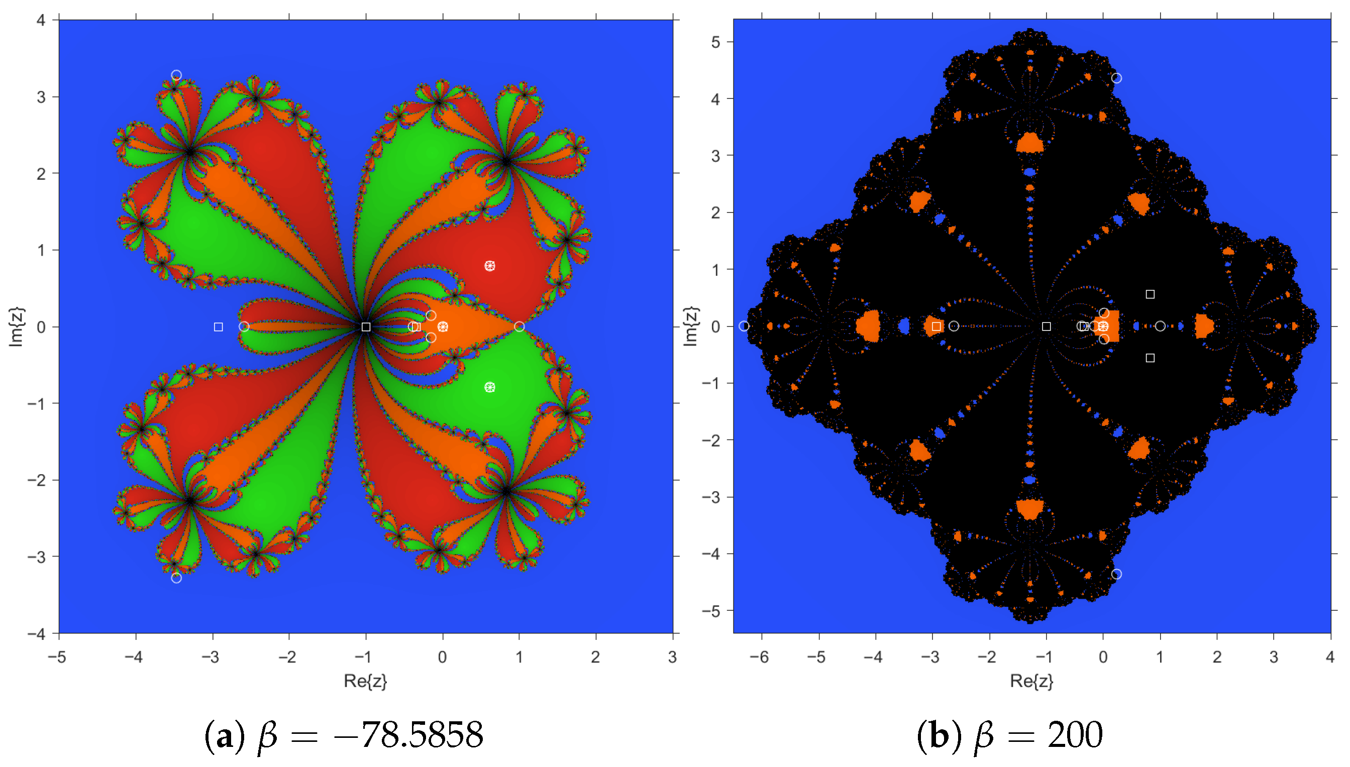 The results reveal that the proposed parametric families, particularly those associated with the modified arithmetic mean (), exhibit stable convergence behavior over large regions of the complex parameter space . Nevertheless, several regions of unstable performance have been identified, including attraction basins unrelated to the roots or convergence toward strange fixed points. Such zones, often visualized as black or green regions in the parameter and dynamical planes, must be avoided in practice. In this context, the detailed study of free critical points is fundamental, as each attractive basin must contain at least one critical point. The behavior of these points has provided early insights into the method’s stability and convergence characteristics. Noteworthy cases such as or illustrate convergence toward undesirable fixed points (e.g., ), despite proximity to the root , emphasizing the importance of well-informed parameter selection.