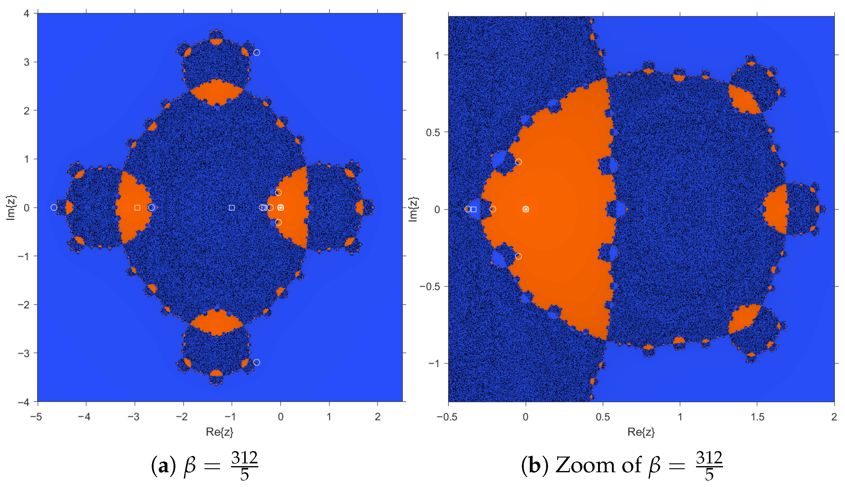 So, the rational operators and are affine conjugate, implying full dynamical equivalence: they share the same structure of fixed points, basins of attraction, and Julia sets, differing only by a uniform scale factor . Hence, all five iterative families belong to a single affine conjugacy class, and the analysis of one representative (e.g., ) suffices to characterize the global dynamics of the entire family. □