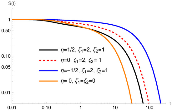 Behavior of the survival probability versus t for different values of by considering the diffusion process with pauses and stochastic resetting. We consider, for simplicity, , , and the initial condition with .