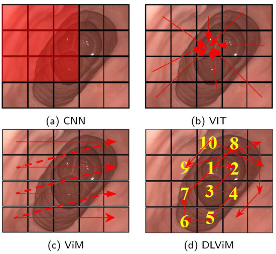 Feature extraction methods in depth estimation. The red rectangle represents the convolution kernel, the red arrows, dotted lines and numbers indicate the processing order of the algorithm. (a) CNN extracts local features using sliding convolutional kernels. (b) ViT splits the image into patches and applies self-attention to model inter-patch relationships, enabling global feature extraction. (c) ViM employs a cross-scanning state space model to efficiently capture global receptive fields. (d) DLViM adopts a depth-first dynamic modeling path to extract global structural features.