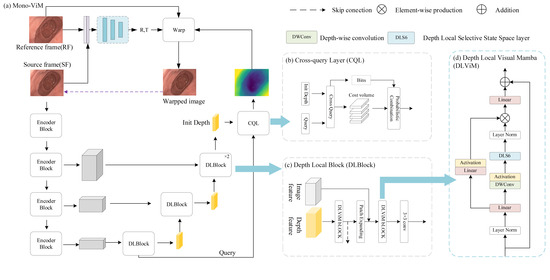The overall framework of the proposed Mono-ViM framework is shown in Figure 2. The decoder plays a critical role in reconstructing the high-level semantic features extracted by the encoder into the original spatial resolution of the input image, producing depth maps with precise structural details and well-defined boundaries. This work introduces a lightweight decoder based on the Mamba architecture, specifically designed to efficiently recover encoded information. The framework comprises a DepthNet and a PoseNet. Given an input image for depth prediction, the DepthNet first estimates its inverse depth map . For a source image and its reference image pair , the DepthNet computes the relative camera motion between consecutive frames. The reference image can then be synthesized using the camera motion , intrinsic parameters K, and the estimated depth from the original image: