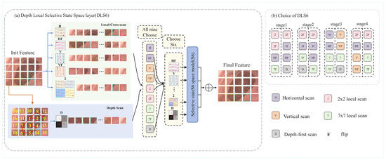 (a) The DLS6 layer, a core module of DLViM, employs nine different methods to process the input feature maps. Among them, four methods use cross-scan modules to flatten the patched feature maps and scan the flattened features in four different directions. Four local-scan methods divide the feature maps into 2 × 2 and 7 × 7 patches and perform horizontal scanning to extract fine-grained features as well as broader local contextual information. The final method is depth-first scan, which traverses the feature map in a depth-first manner to model hierarchical semantic paths and capture richer global contextual information. (b) Visualization of Search Strategies Across Different stages.