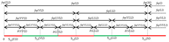To construct the similarity interval system S(k) for the word set (k) in the case of a HA with two generators and two hedges, first of all, we generate the words set with length exactly k+2, k+2, compute the FM for all x k+2, and arrange them linearly from left to right, following the order of their words. The similarity intervals corresponding to 0 and 1 are the first and the last among the fuzzy intervals of k+2, respectively. The fuzzy similarity interval of word x (k) is defined by concatenating two fuzziness intervals in k+2, one of which has an endpoint equal to the quantitative value ϑ(x).