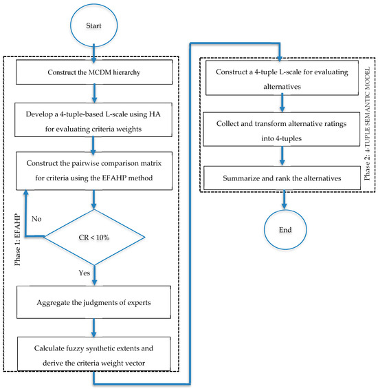 To overcome this constraint, Nguyen et al. [2] proposed the 4-tuple semantic model (x, , ϑ(x), r) where x is an L-word, is its fuzzy interval representing the quantitative semantic range of x, ϑ(x) is its quantitative value, and r is a reference value such that both ϑ(x) and r belong to . The difference between ϑ(x) and r, referred to as the semantic deviation, indicates the extent to which the meaning of x diverges from the reference. This model allows conventional mathematical operations (e.g., average, weighted average) to be directly applied to L-words via their quantitative values, thereby enhancing the flexibility and computational efficiency of processing L-information compared with the traditional fuzzy set-based or symbolic methods. Nevertheless, in the applications [2,22], the authors did not propose any method for determining the weights of the criteria. Instead, subjective expert-assigned weights were adopted, which may lead to bias in judgment and low reproducibility of results. This limitation highlights a methodological gap in existing studies that employ the 4-tuple semantic representation but do not systematically address the weighting process, which is a crucial factor in MCGDM. To address this weakness, this study integrates the 4-tuple semantic model into the EFAHP framework, which enables the derivation of data-driven and linguistically grounded weights rather than purely subjective ones. In addition, a new consistency index (CI) is proposed to evaluate the internal reliability of pairwise comparisons, ensuring greater robustness and methodological transparency in the weighting process. This integration not only enhances the objectivity of MCGDM analysis but also strengthens the semantic interpretability of expert judgments.