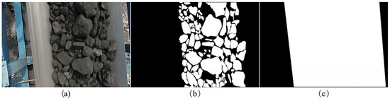 We made the corresponding ground truth (Figure 3b) and mask image (Figure 3c) of the original images using LabelMe software. The mask images are used to submerge the area outside of the conveyor belt.