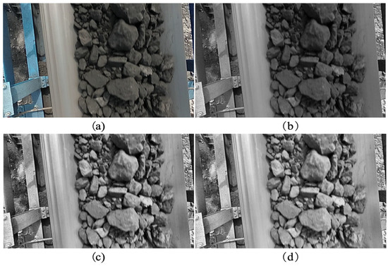 The three methods used in image preprocessing are graying, the contrast limited adaptive histogram equalization (CLAHE) processing and bilateral filtering. Graying is to reduce the amount of image data and speed up the training and prediction of the model. The CLAHE method is implemented through the CLAHE algorithm integrated by OpenCV. It can effectively limit the noise amplification, enlarge the contrast, and make the gap between coal blocks more obvious. The process of preprocessing is shown in Figure 5. In addition, we would like to illustrate that the use of preprocessing techniques is for the convenience of model training and does not affect the comparative experimental results of this paper—because all the models are tested in the environment of the same dataset.