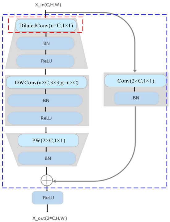 where and are the input and output feature map, respectively, represents the dimension-increasing convolution of the input (right), and represents the middle depth-wise and pointwise convolution part of the DIR module.