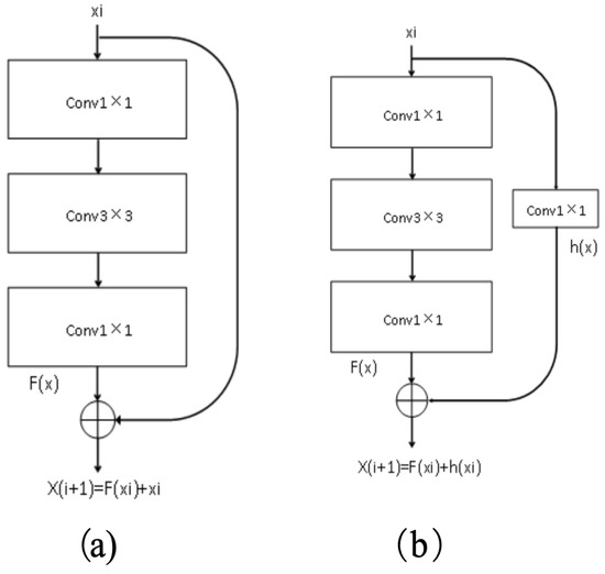 Schematic diagram of two residual connection forms. (a) The input is the same as the output, (b) the input is different from the output.