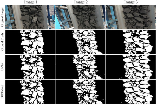 Figure 12 shows the loss curve of the proposed method during the training process. The loss value indicates the degree to which the network fits the training data. The lower the value, the better the fitting effect. The training results prove that the DIRU-Net we proposed correctly fits the coal block image data in the training set and can accurately classify and predict the labels of the vast majority of pixels.
