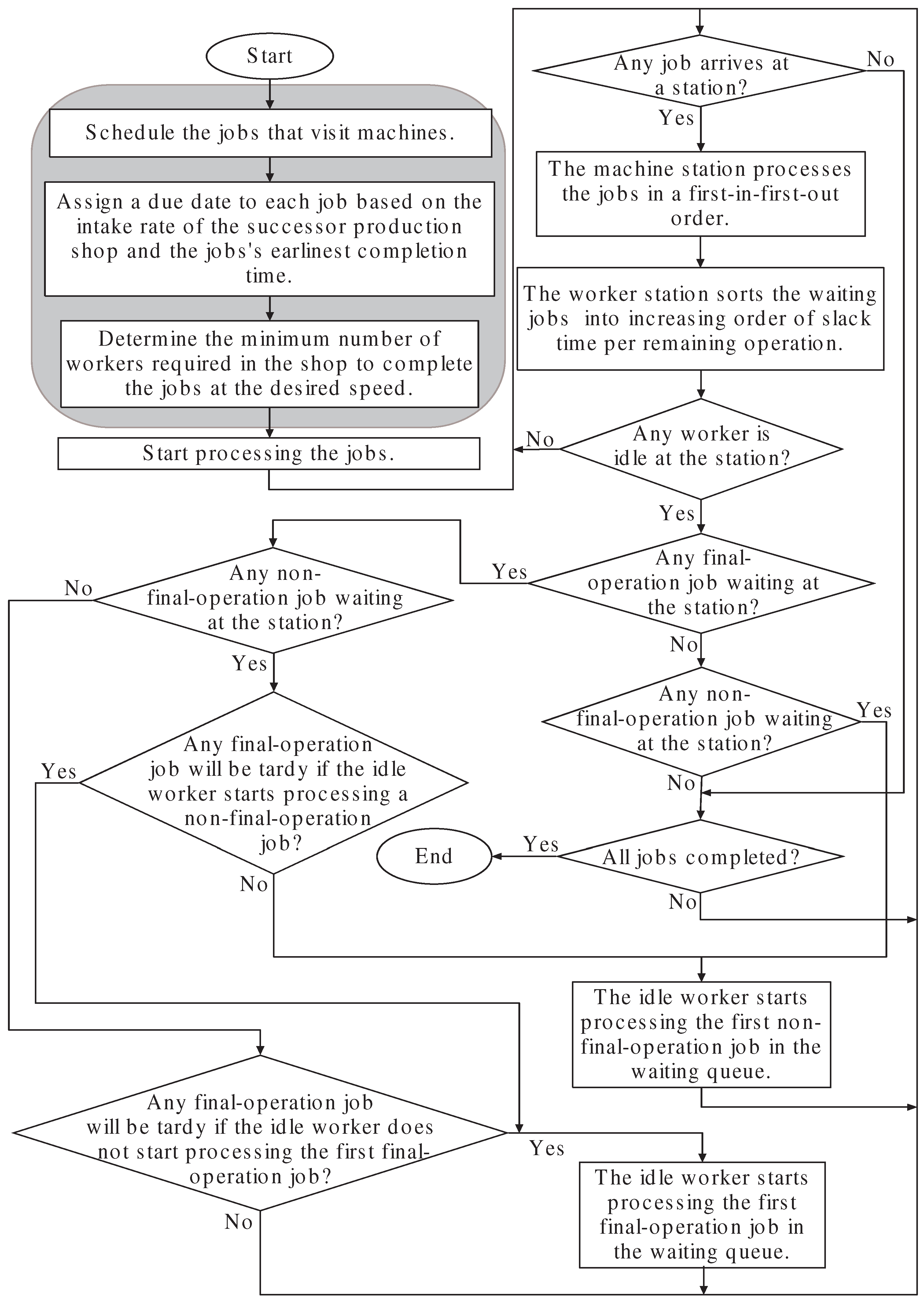 This study proposes a scheduling and production control method for the FJS production shop described. The method includes two stages: an offline scheduling stage and an online processing control stage. The offline stage schedules jobs that go through the machine stations, assigns a due date to each job based on the intake rate of the downstream production shop, and determines the minimum number of workers required to complete all the jobs by their respective due dates. The online stage determines the processing sequence of the waiting jobs at the worker station and controls the start time of processing the jobs at their final operations.