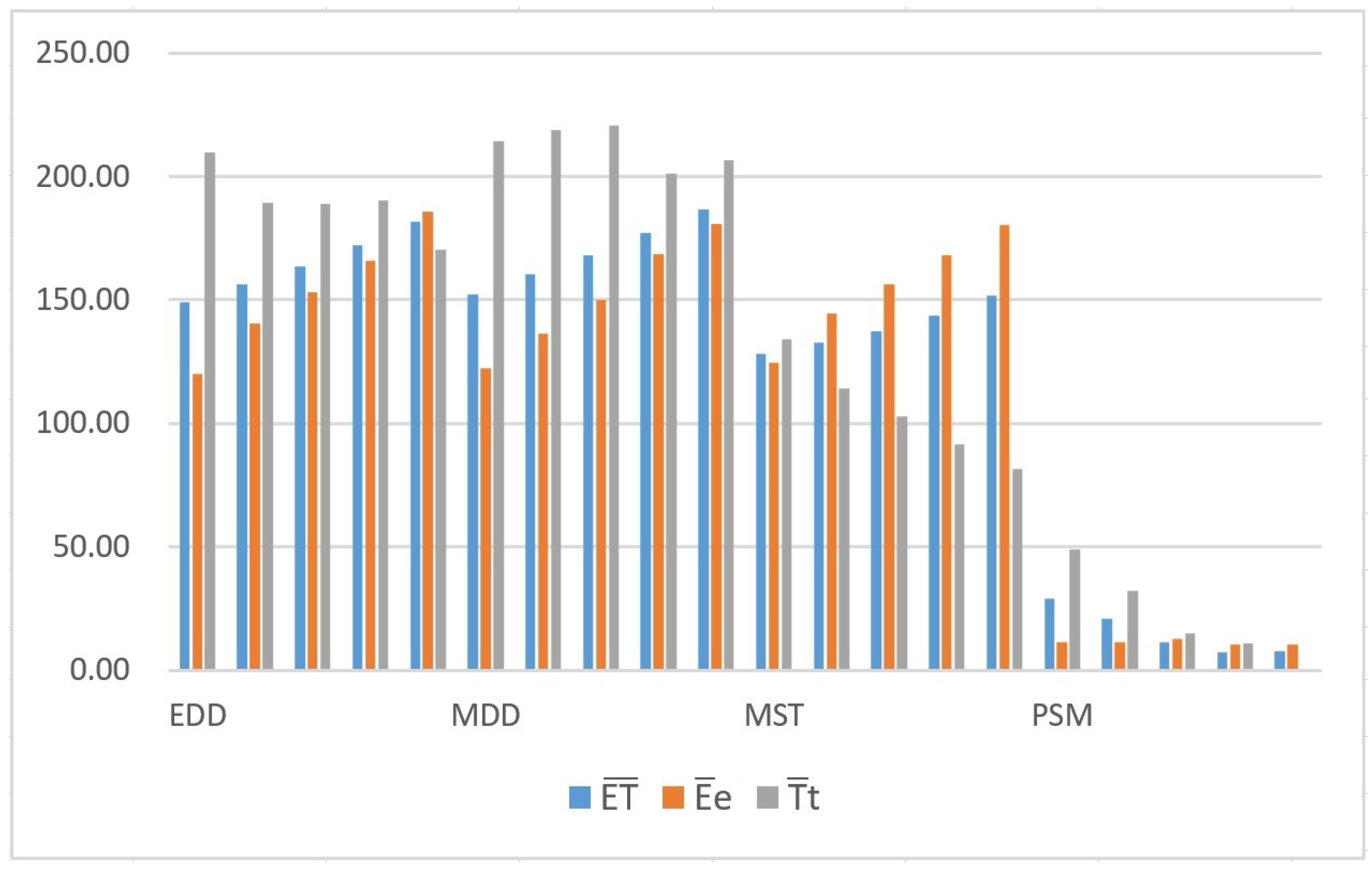It is observed that when the due date parameter = 900 (equivalent to 15 h), the proposed scheduling method successfully completes all jobs without any instances of tardiness. Furthermore, the average earliness in job completion times from their respective due dates is limited to just 7.6 min, indicating a high level of scheduling precision. From the perspective of JIT production, where minimizing both early and tardy job completions is critical, this outcome is notably effective. In comparison to alternative scheduling rules, the proposed method demonstrates clear superiority across multiple performance indicators, including the average earliness and tardiness (), the number of tardy jobs (), and the corresponding standard deviations. These improvements suggest that the proposed method not only ensures timeliness, reducing inventory space and management, but also provides higher efficiency and less labor costs.