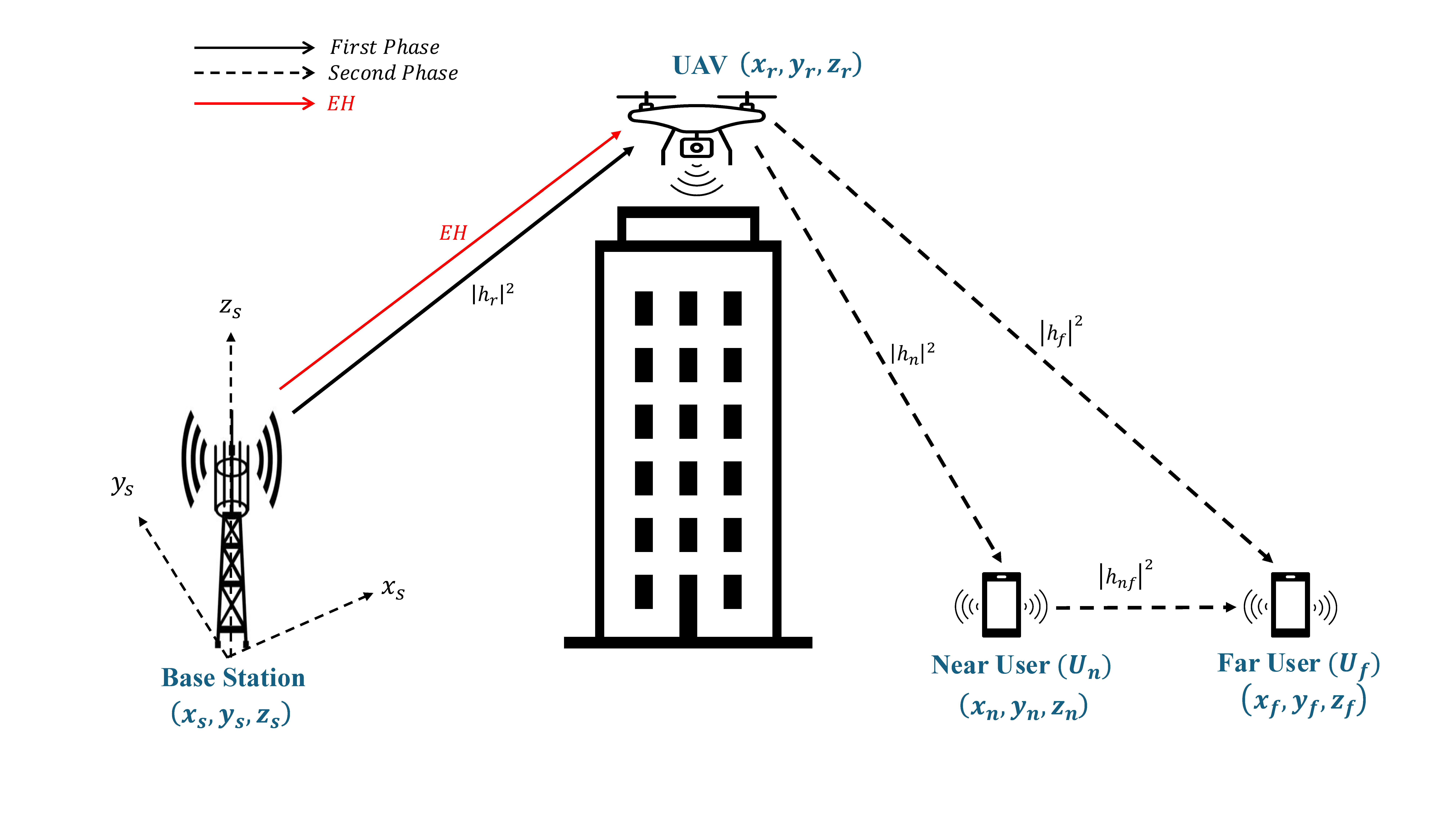 Research on downlink (DL) NOMA with UAVs, SWIPT, and cooperative communication has been widely investigated. NOMA has been extensively explored in the literature due to its ability to deliver superior performance compared to existing multiple access schemes. One of the distinguishing features of NOMA is its capability to leverage the near user’s awareness of other users’ information, enabling integration with cooperative communication techniques [8]. Cooperative NOMA (C-NOMA) can enhance spatial diversity to improve the far user’s rate and expand cell coverage. In C-NOMA, the near user with better channel gains acts as a relay to transmit the far user’s signal, thereby enhancing the reception reliability of the far user, as it receives its information from the near user and the base station (BS) [9]. Research on C-NOMA initially focused on half-duplex (HD) mode [10], and the result demonstrated that the outage probability performance can attain the maximum achievable diversity gains. In [11], a C-NOMA system with SWIPT was studied, where the near user harvested energy to forward the information to the far user. Nevertheless, the near user’s rate was significantly decreased due to the additional timeslot required for HD mode.