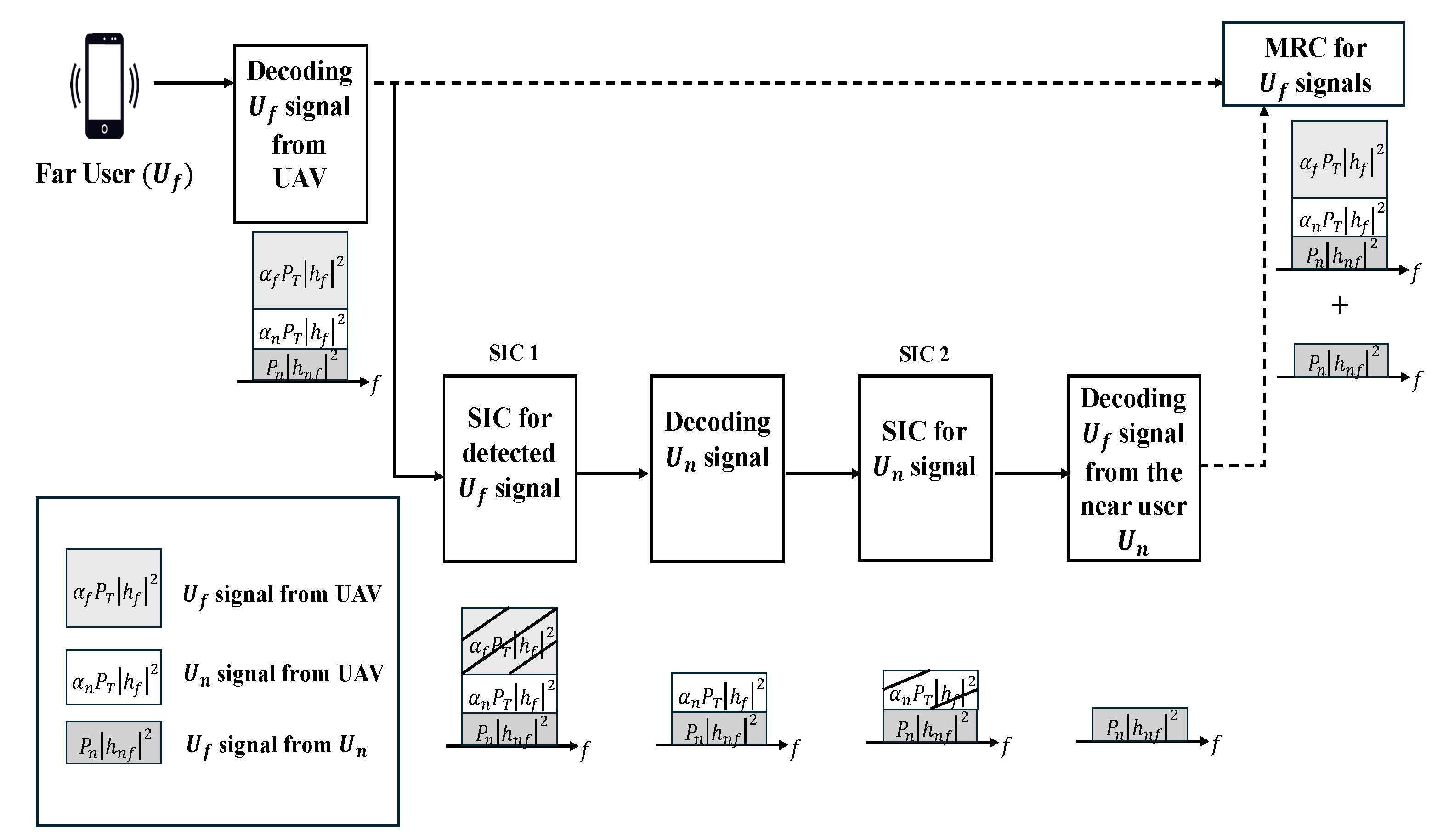 In practice, imperfect SIC may cause a small amount of residual interference after signal cancellation, which slightly reduces the achievable user rate. Although U f will receive the NOMA signal from the UAV, it will also receive a relayed signal from U n . The details are discussed in the next subsection.