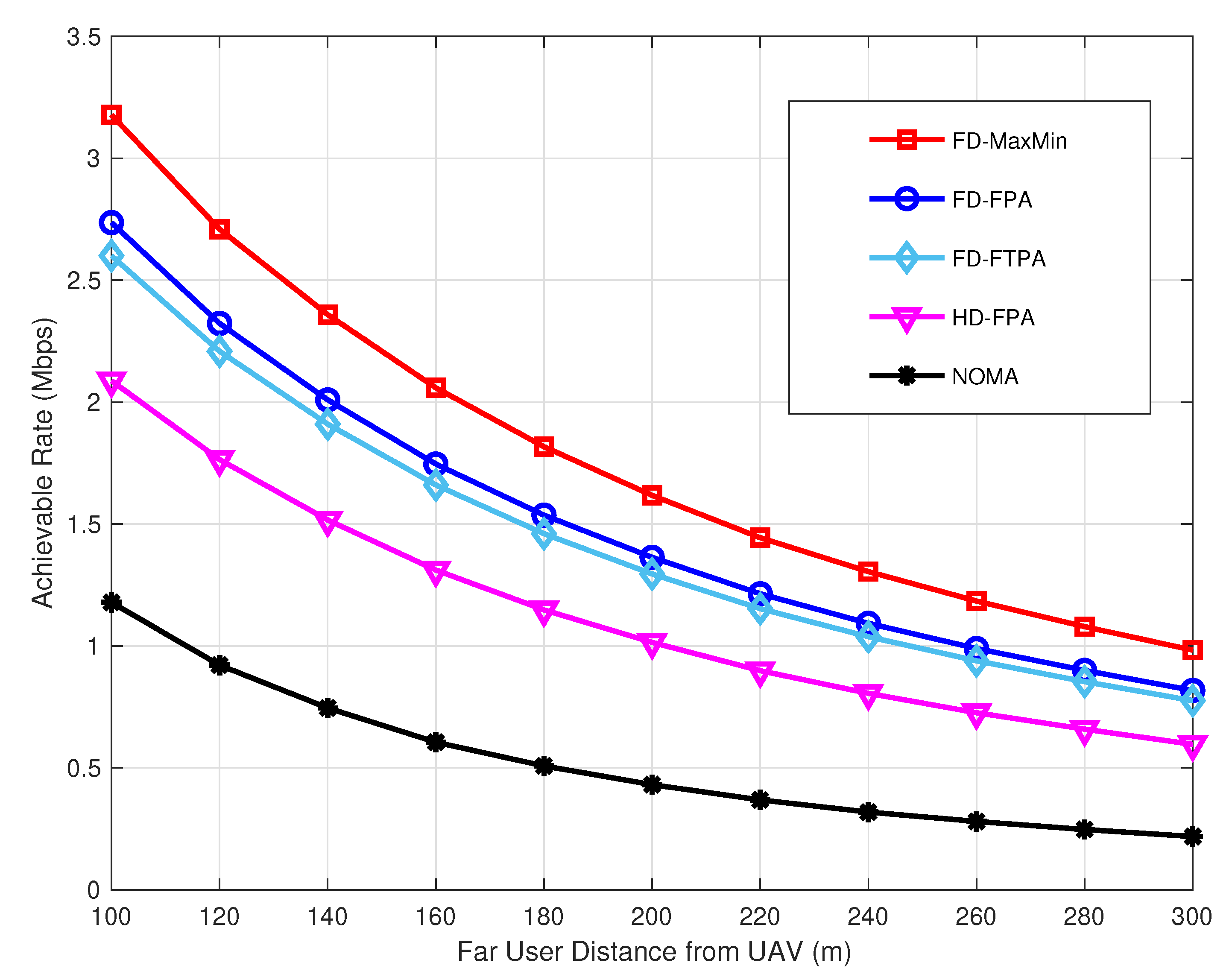 The rest of this paper is organized as follows: Section 2 describes the system model used in this study. Section 3 presents the performance analysis of the proposed UAV-assisted FD C-NOMA system. In Section 4, the power control scheme for the near user’s transmission power is illustrated. Section 5 describes the formulation of the closed-form power allocation schemes. In Section 6, numerical simulation results to evaluate the system’s performance are presented. Lastly, Section 7 concludes the paper.