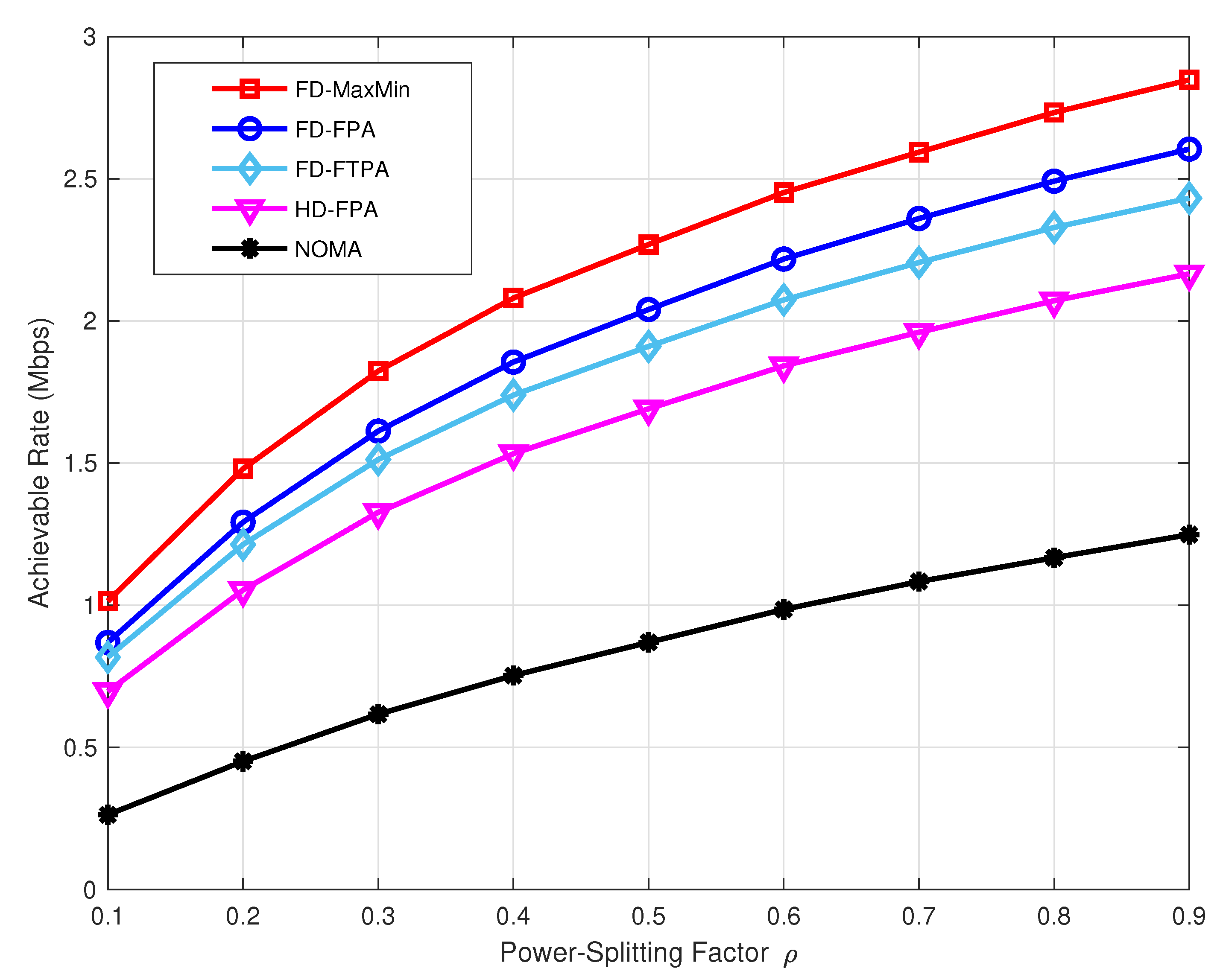 Figure 9. Far user rate performance versus power-splitting factor ρ .