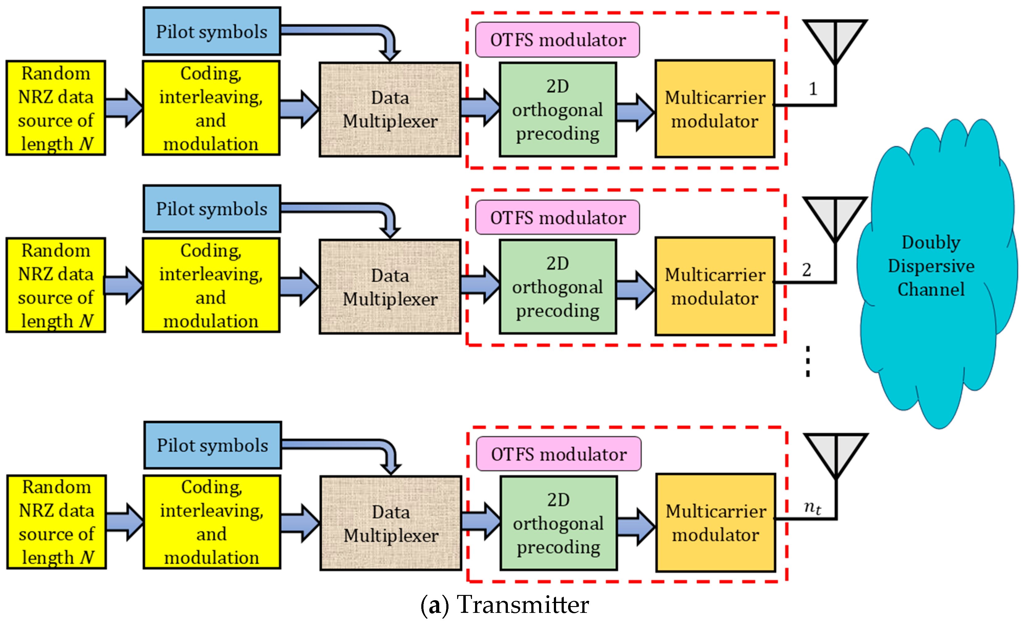 Figure 1 illustrates the block architecture of an MIMO-OTFS transceiver system, where and represent the number of transmitting and receiving antennas, respectively. Operating in environments with significant Doppler shifts and multipath delays, the system leverages OTFS modulation to map data symbols into the delay-Doppler domain. This transformation enhances robustness against channel variations. The block diagram encapsulates the parallel processing of multiple input streams, highlighting the synergy between spatial multiplexing in MIMO and the resilience of OTFS against doubly dispersive channel effects. Together, these techniques enable more reliable and efficient wireless communication in dynamic propagation environments.