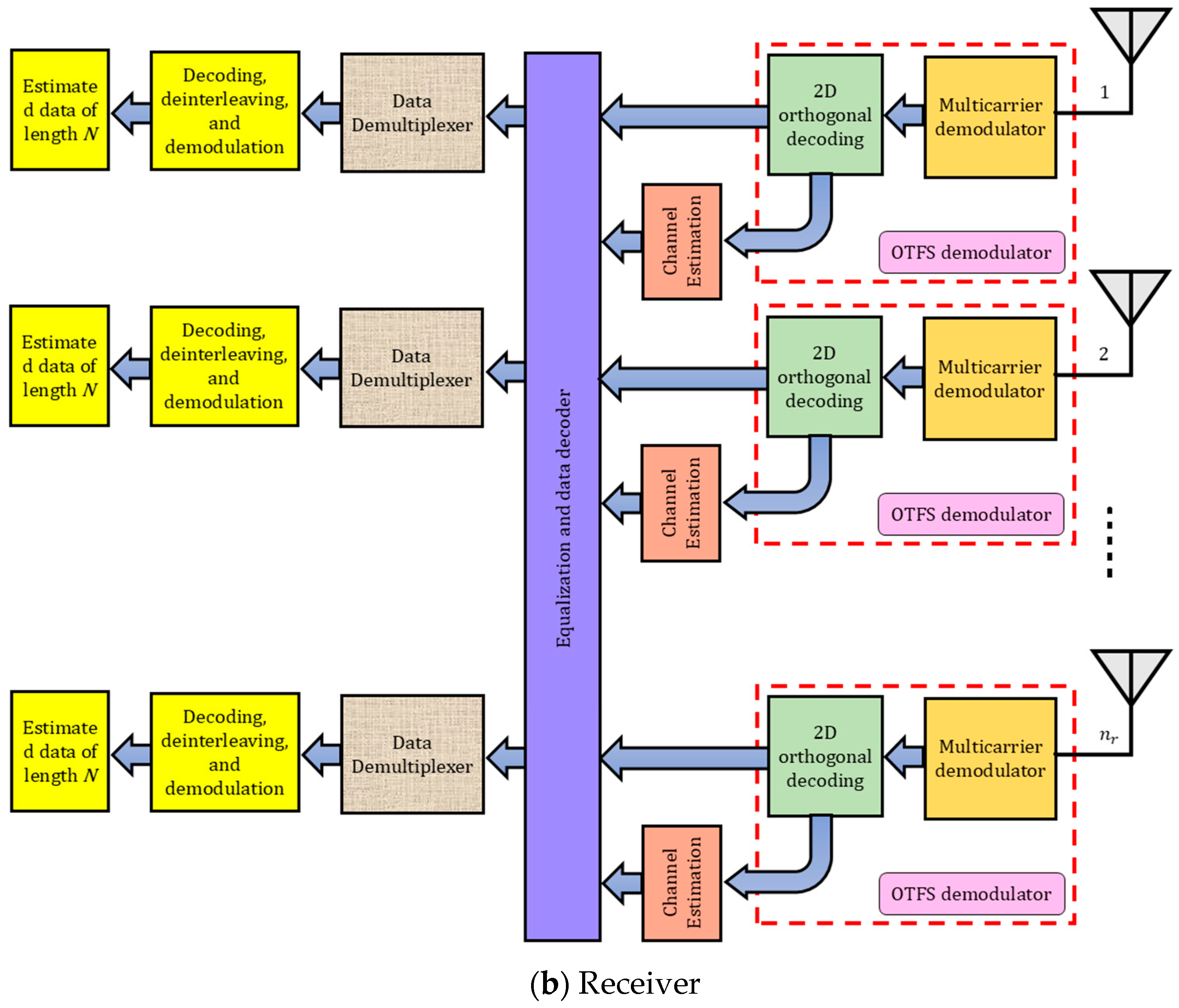 - Singh, P.; Gupta, A.; Mishra, H.B.; Budhiraja, R. Low-Complexity ZF/MMSE MIMO-OTFS Receivers for High-Speed Vehicular Communication. IEEE Open J. Commun. Soc. 2022, 3, 209–227. [Google Scholar] [CrossRef]