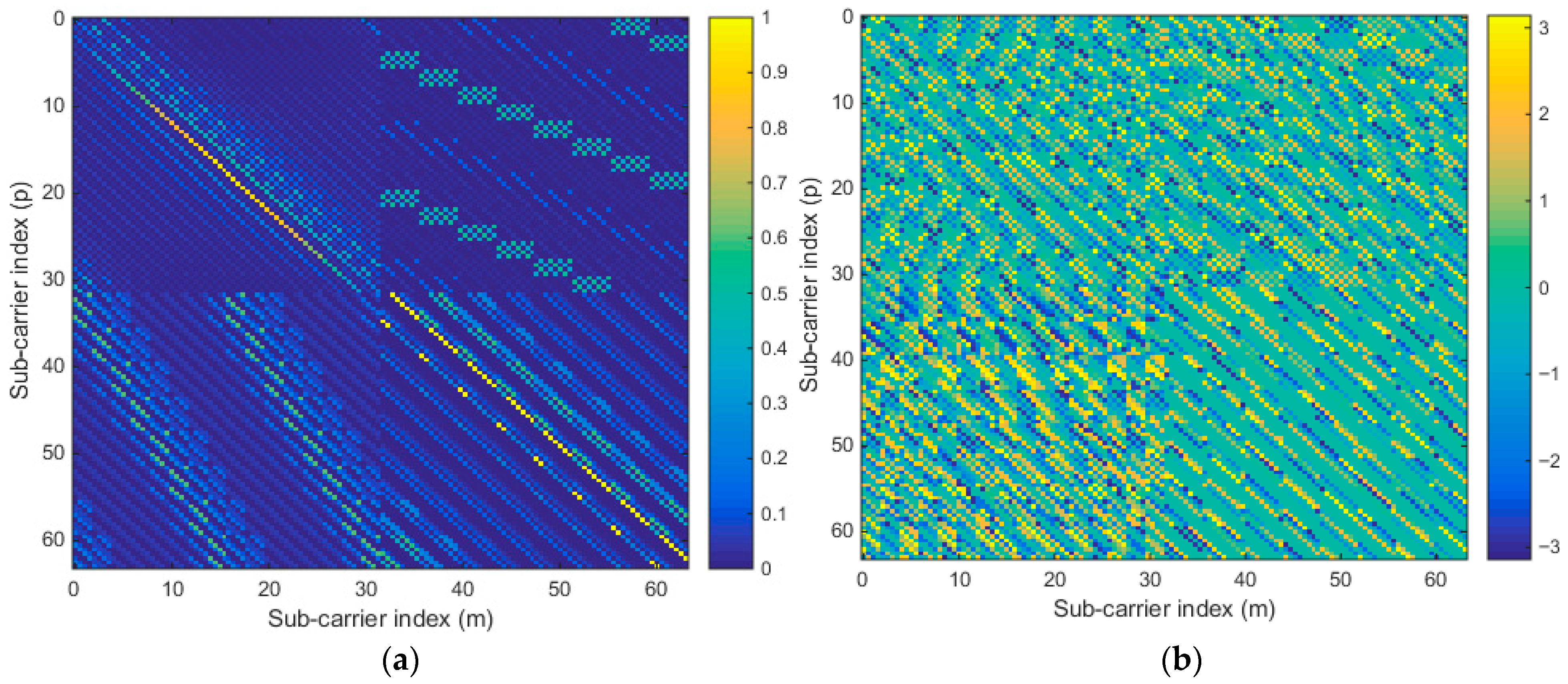 Figure 2a,b depict the average magnitude and phase, respectively, of the Composite Channel Matrix (CCM) associated with , as defined in Equation (7), for a 2 × 2 MIMO system. The CCM offers a detailed characterization of the input–output behavior in the delay-Doppler domain within the MIMO-OTFS framework. It is evident from the visualizations that the matrix exhibits a near full-rank structure, reflecting substantial inter-symbol interactions across spatial and delay-Doppler dimensions. This dense coupling poses a significant obstacle to the application of the Banded Matrix Approximation (BMA) method [32], which seeks to lower equalization complexity by leveraging sparsity or localized interference patterns. However, the observed widespread energy distribution in the CCM indicates that most entries contribute meaningfully, thus limiting the potential efficiency gains of BMA in this context.