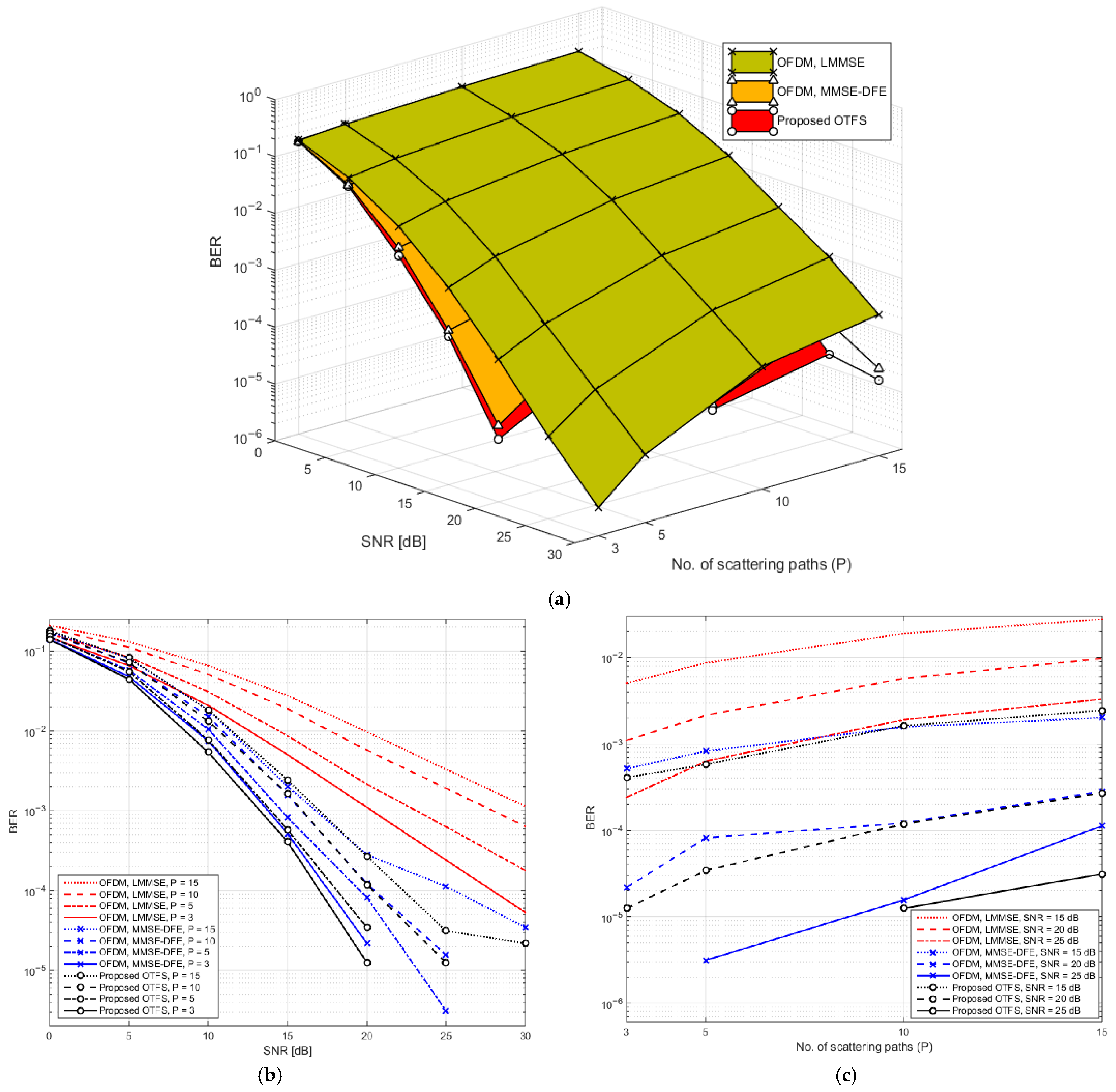 Figure 4a illustrates a three-dimensional surface plot that captures the BER behavior as a function of SNR and the number of multipath components (denoted as ). The figure compares the performance of the proposed MIMO-OTFS system utilizing MMSE-DFE equalization against a conventional MIMO-OFDM system implemented with MMSE-DFE and LMMSE techniques. This visual representation effectively conveys the dynamic interplay between channel richness and noise levels, providing insight into system robustness across varying propagation conditions. As evident in the plot, the BER tends to decrease with increasing SNR, a trend consistent with improved signal fidelity at higher power levels. Conversely, an increase in the number of channel scattering paths leads to higher BER values, reflecting the detrimental impact of ISI in richly scattered environments—especially under doubly dispersive channel conditions. This performance degradation is particularly challenging for conventional systems like OFDM, which are more susceptible to delay and Doppler spread. To further clarify the behavior observed in the 3D plot, Figure 4b,c present two-dimensional projections. Figure 4b offers an elevation perspective, emphasizing BER variations with respect to SNR across different values of . It clearly shows that as the number of scattered paths increases, the performance gap between the proposed OTFS system and traditional OFDM widens. This underscores the enhanced robustness of OTFS in handling severe multipath and time-frequency dispersion. Figure 4c, presents a side-view projection, focusing on how BER responds to changes in the number of scattering paths at fixed SNR levels. This perspective highlights the sensitivity of each modulation scheme to channel complexity, reinforcing the advantage of the OTFS-based approach in highly dynamic and dispersive environments.
