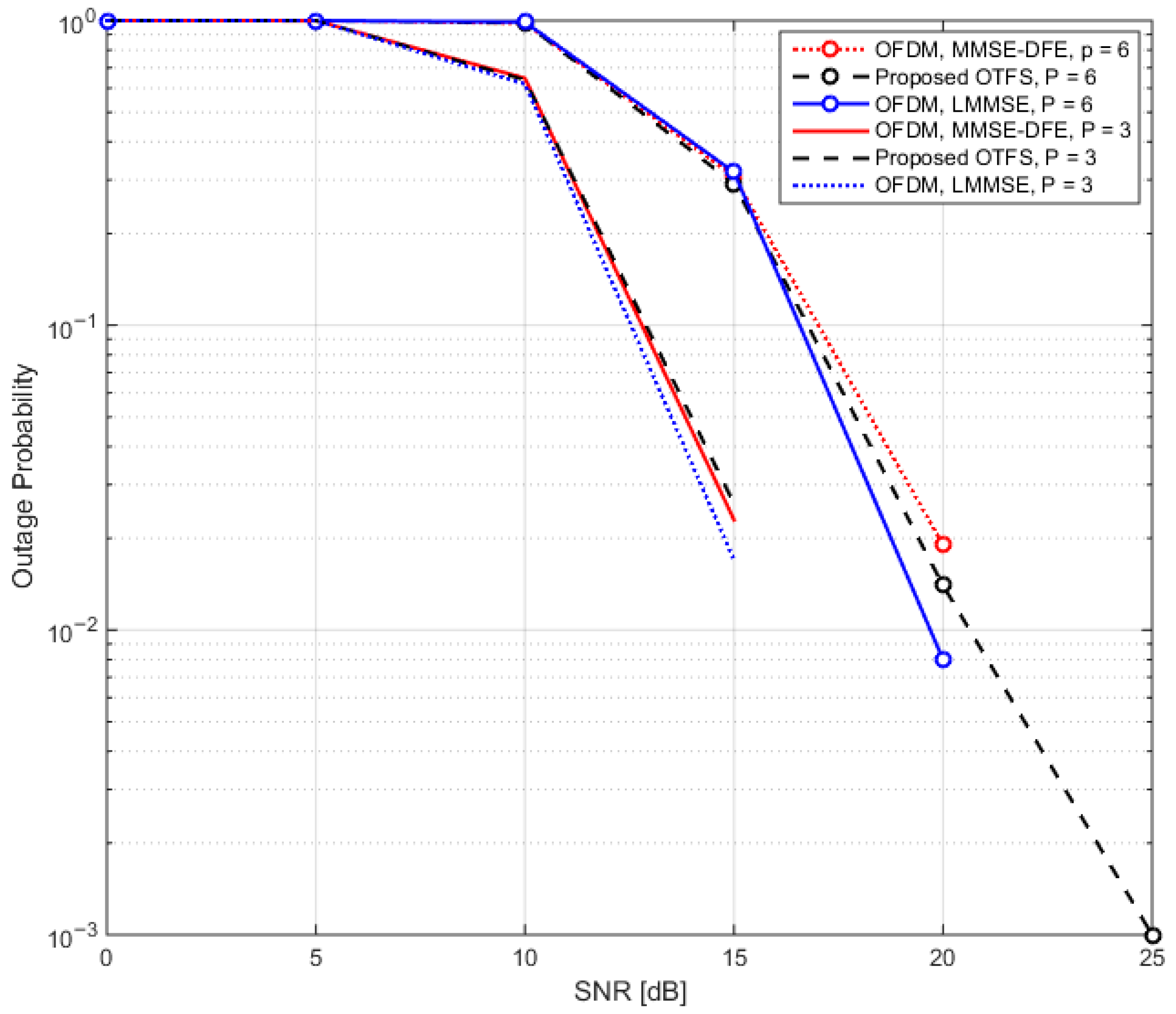- A comparison of the outage probability between the proposed OTFS scheme and the conventional OFDM scheme under challenging channel conditions. The results demonstrate that OTFS performs similarly to OFDM in terms of outage probability, highlighting its potential for reliable communication in doubly dispersive and fading channels.