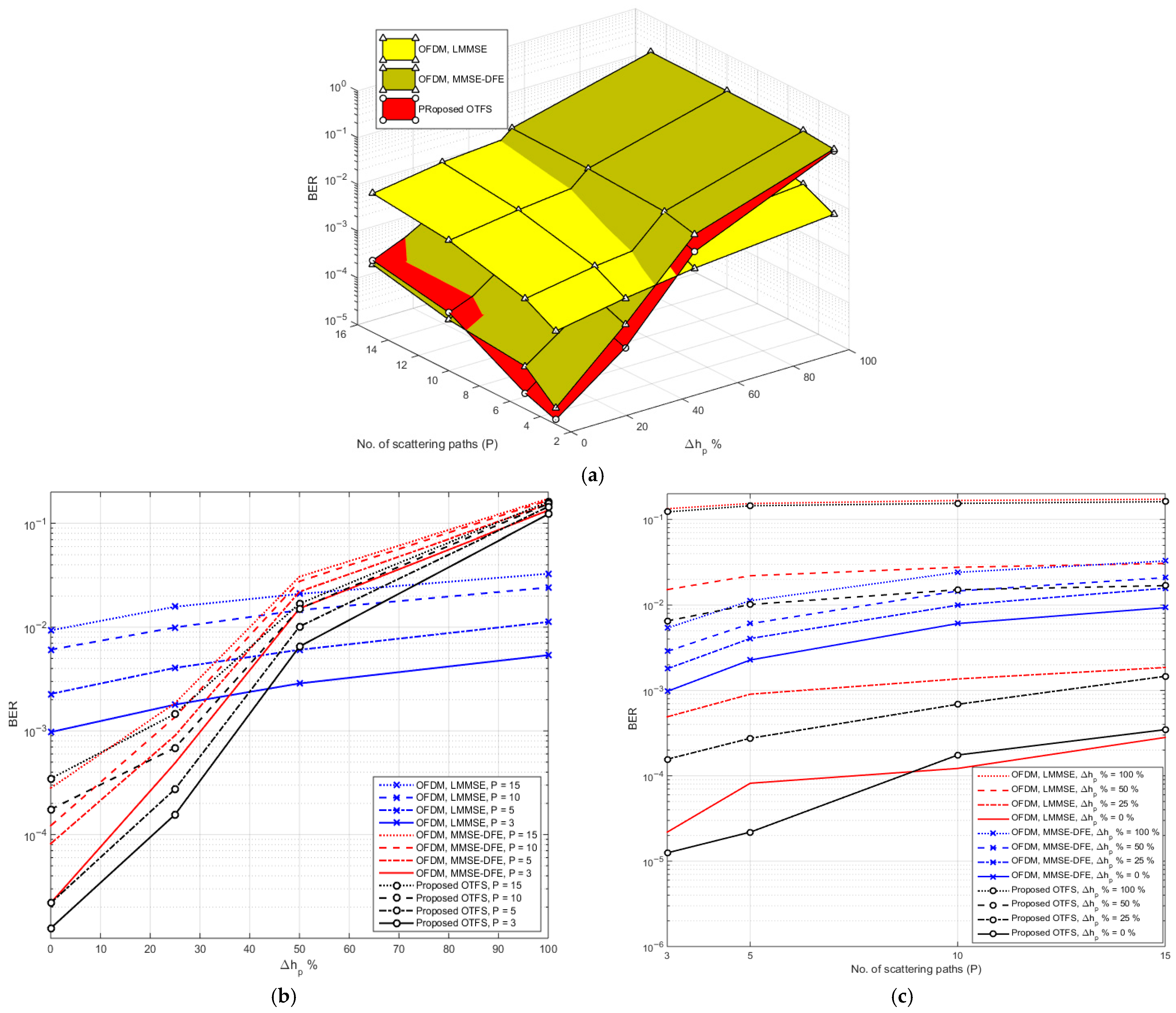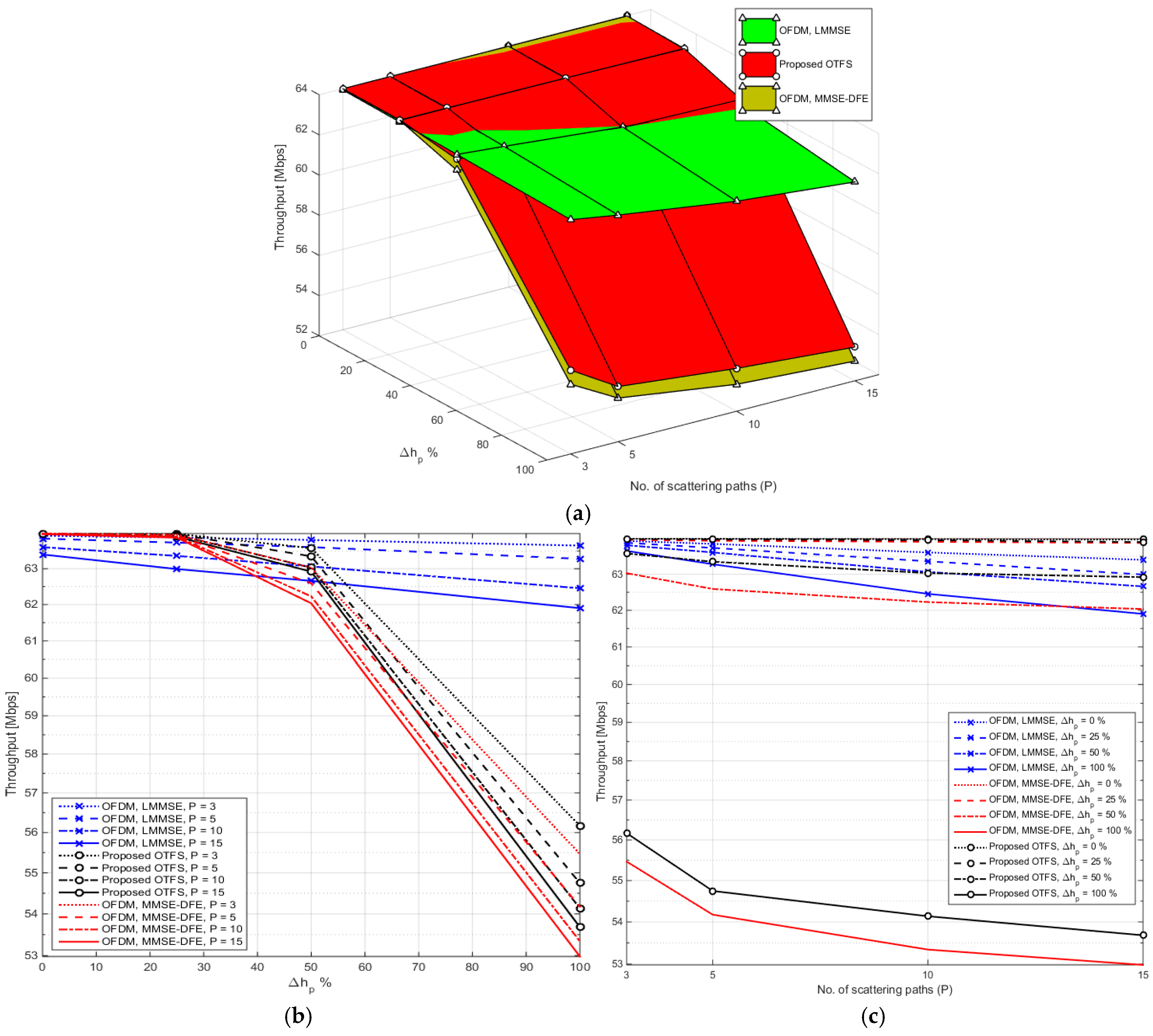 The side view (Figure 10c) emphasizes the effect of the number of scattered paths on throughput. As increases, the proposed OTFS system begins to exhibit a sharper decline, especially when coupled with high estimation error. OFDM-LMMSE again stands out by showing very modest throughput degradation across increasing multipath conditions, making it a more dependable solution for real-world channels with varying delay spread or Doppler spread.