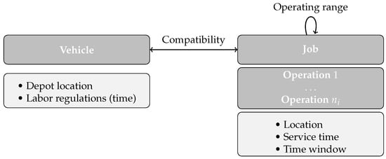 Figure 1 depicts a simple schema to better understand the problem of interest. In our particular case, machines are represented by vehicles, with the only imposition of starting and ending at their depot location, and they must also respect the labor regulations. Furthermore, customers request jobs to be scheduled by paying a cost. Every job consists of operations that have an associated location, service time, and time window. These operations could be loading, unloading, or mandatory jobs.