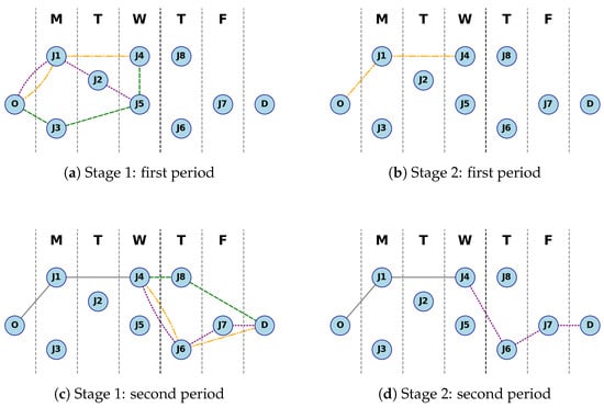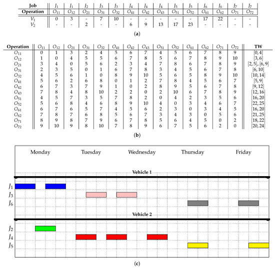 To close this section, Figure 2 includes an illustrative example with two vehicles (denoted by and ) and seven job requests from customers (denoted by ) that must be scheduled in a planning horizon of five working days within a week. In this particular case, jobs 1, 3, 5, 6, and 7 have two operations, denoted by and for , which may represent loading and unloading operations, each one in a different location; job 2 has one single operation, , which likely represents a mandatory job in a given location and has two associated time windows, while job 4 has three operations, which may first represent a loading operation in a given location, , and then two unloading operations in two different locations, and . The columns of Figure 2a include the processing times for each operation and represent the start time of each operation. Note that, for simplicity in this illustrative example, it is assumed that all operations have the same duration and that the distance and travel time between operations are equal. In addition, Figure 2b shows the time/distance matrix between operations, and the last column, denoted by TW, specifies their associated time windows.