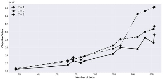 Equation (42) represents the total incurred cost (objective function), encompassing the cost of transportation services (first term) plus the penalty cost for any job that is not scheduled (second term). Equation (43) ensures that each vehicle is assigned to at most one sequence . Equation (44) enforces that each job is scheduled by at most one vehicle across all selected sequences. Finally, Equation (45) defines the decision variables as binary, where if sequence i is assigned to vehicle v and 0 otherwise.