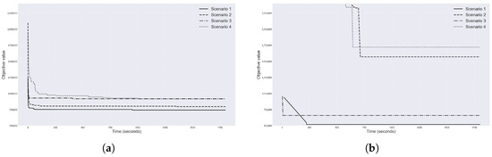 The Gantt chart is depicted in Figure 2c. Jobs 1, 3, and 6 are scheduled on the first vehicle, while the second vehicle is assigned jobs 2, 4, and 5. As can be observed, the first vehicle will start operations 1 and 2 of job 1 at times 0 and 3, respectively; then, operations 1 and 2 of job 3 are scheduled at times 7 and 10, respectively. Finally, the first vehicle ends the planning horizon, performing operations 1 and 2 of job 6 at times 17 and 22, respectively. Meanwhile, the second vehicle starts its activity at time 2 with the only operation of job 2; then, the three operations of job 4 are scheduled at times 6, 9, and 13, respectively. To finish the schedule of the second vehicle, the two operations of job 5 are planned at times 17 and 23. It is important to note that the gaps between operations in the Gantt chart represent the travel time between consecutive operations. Suppose that the cost per unit of distance is 1 µm and that the penalty for not scheduling a job is 10 µm. The total distance traveled by the vehicles is therefore 23 units, resulting in a travel cost of µm. Since job 7 was not scheduled, a penalty of 10 µm is added. Consequently, in this case, the objective function value would be µm.